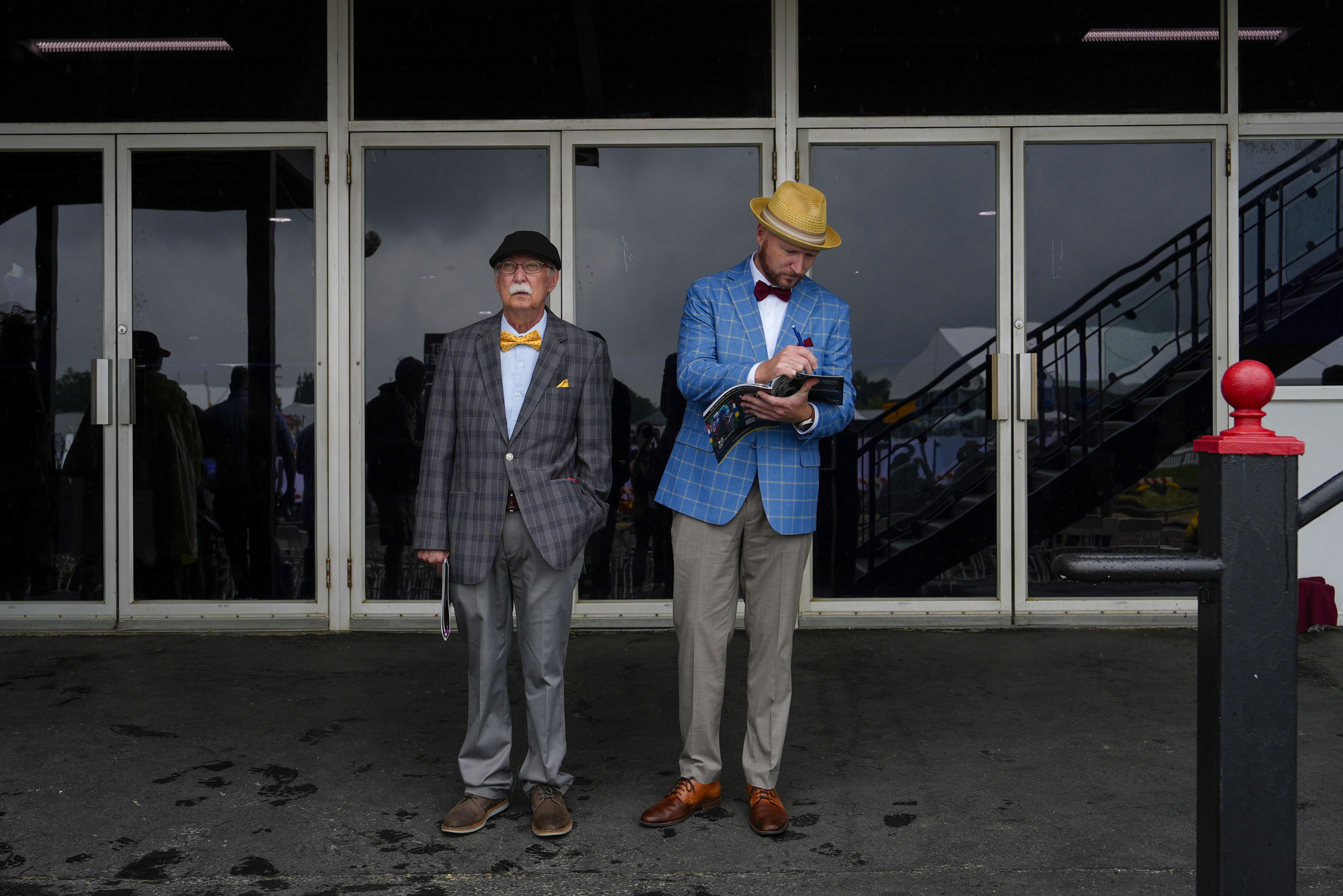 David Brauer and Andy Brauer wait for an undercard race to begin ahead of the Preakness Stakes horse race at Pimlico Race Course, Saturday, May 18, 2024, in Baltimore. (Photo by Julia Nikhinson/AP Photo)
