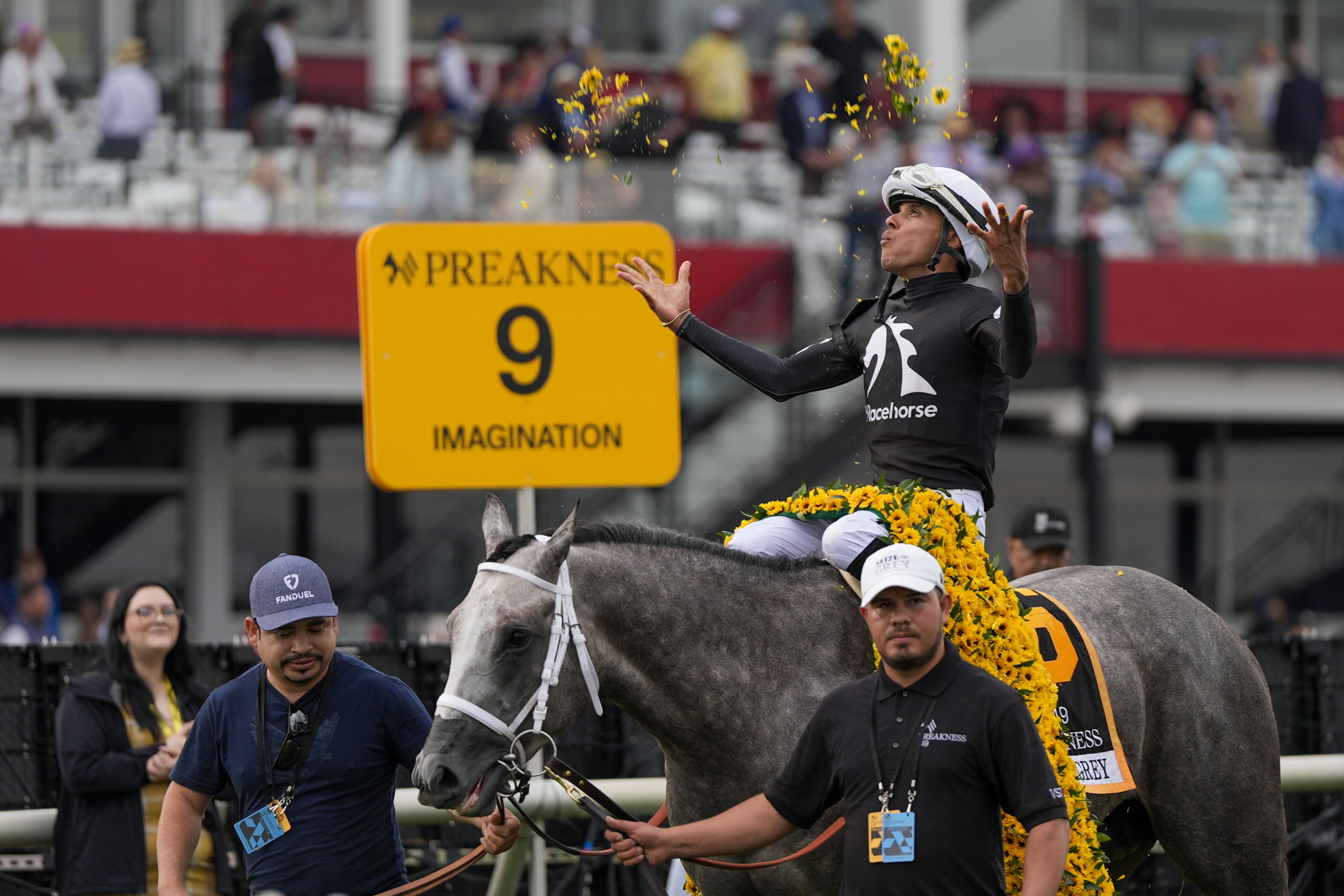 Jaime Torres, atop Seize The Grey, reacts after winning the Preakness Stakes horse race at Pimlico Race Course, Saturday, May 18, 2024, in Baltimore. (Photo by Julia Nikhinson/AP Photo)