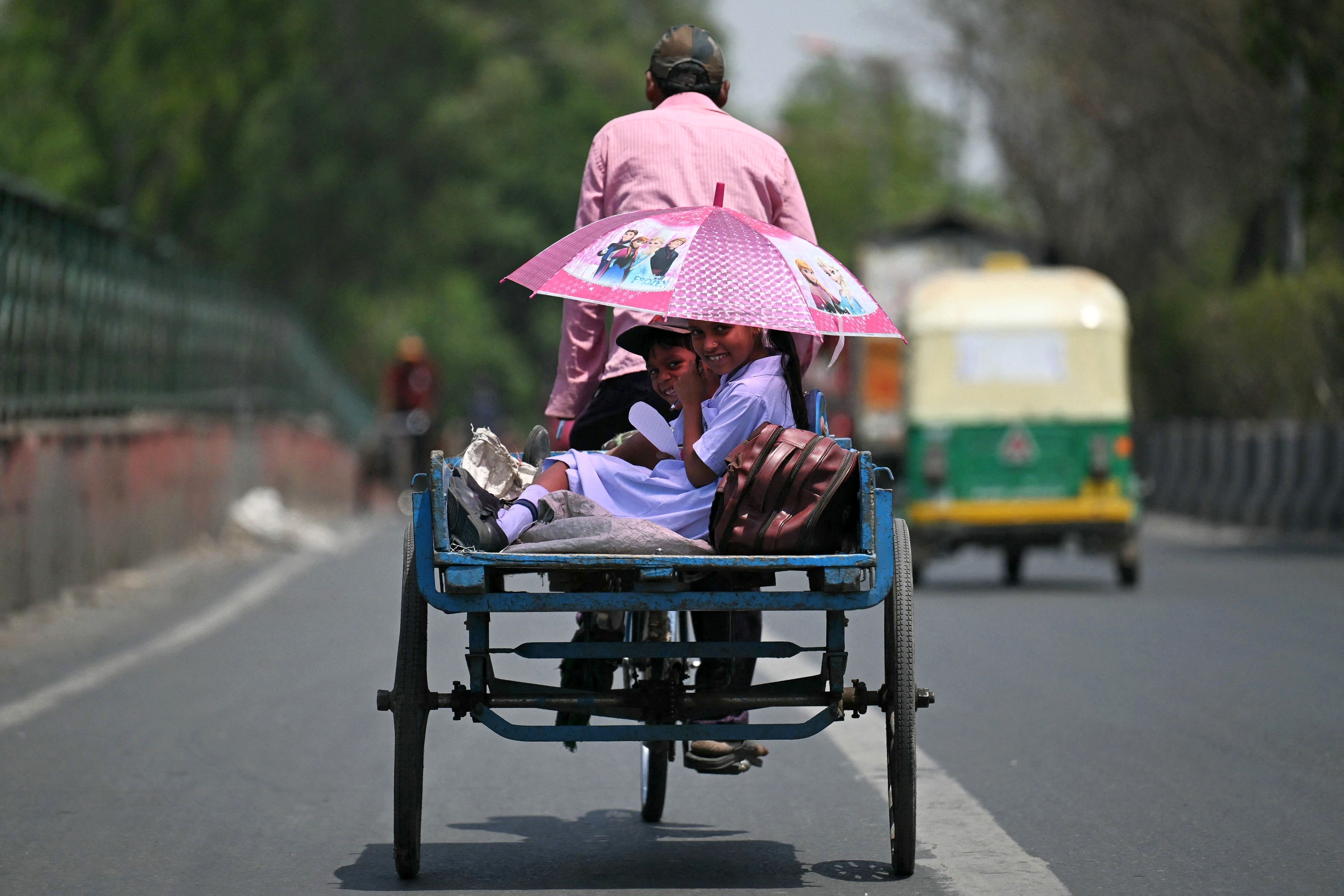 Children shelter from the sun under an umbrella while travelling in the back of a bicycle cart during a hot summer day in New Delhi on May 2, 2024. (Photo by Arun Sankar/AFP Photo)