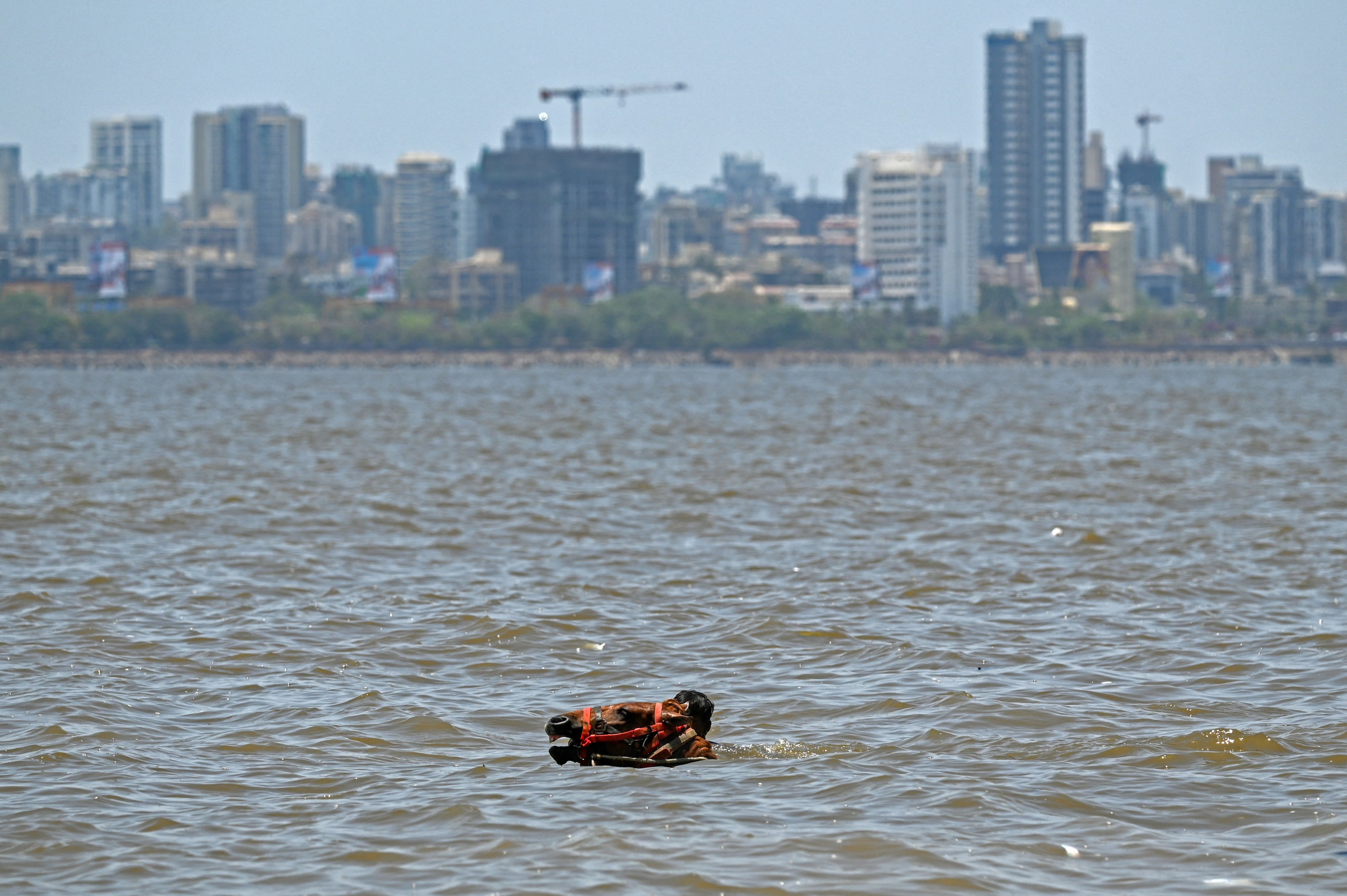 A caretaker takes his horse for a dip in sea on a hot summer day in Mumbai on May 8, 2024. Extensive scientific research has found climate change is causing heatwaves to become longer, more frequent and more intense. (Photo by Punit Paranjpe/AFP Photo)