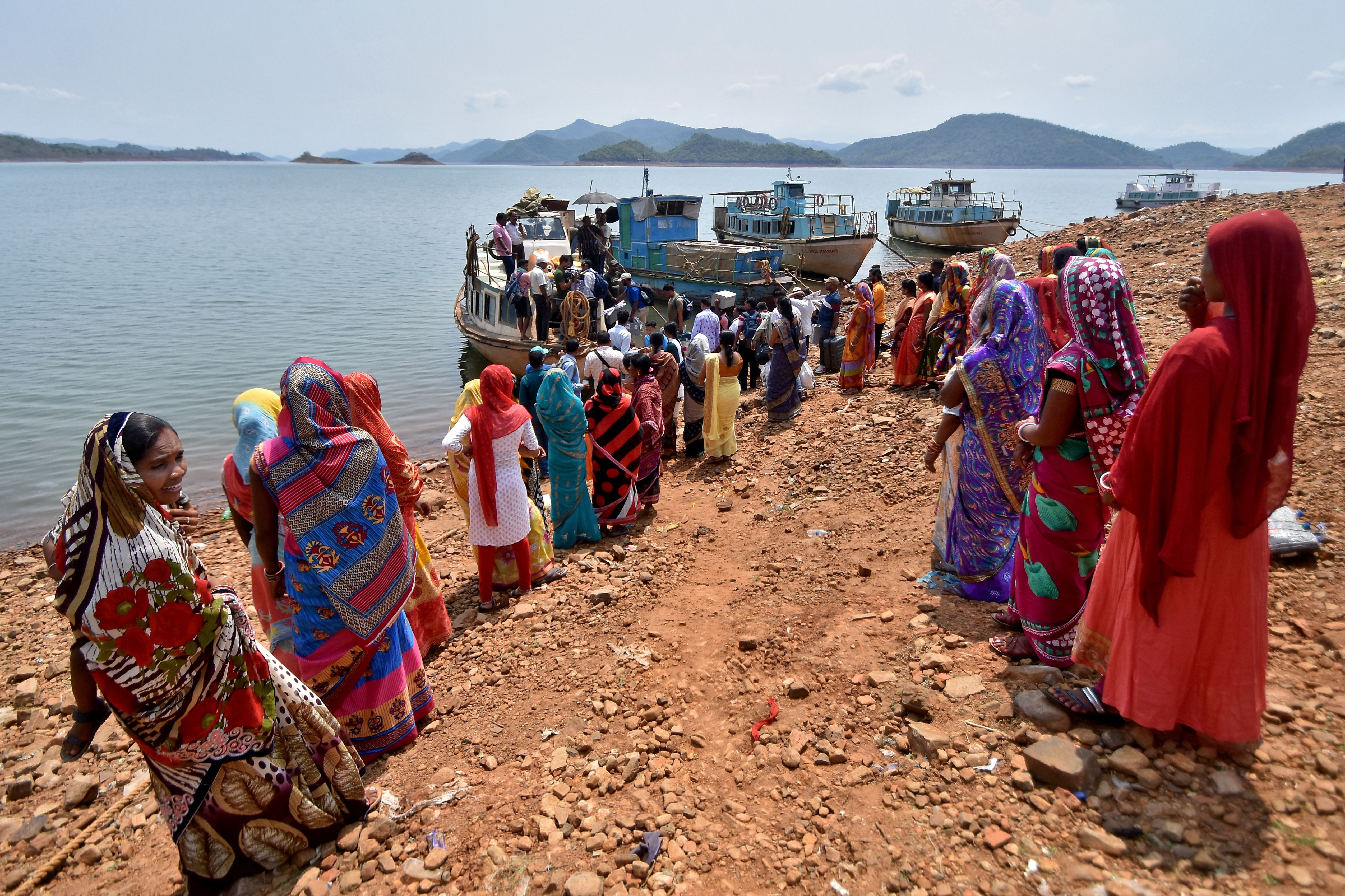 Women gather to welcome polling officials as part of a ritual as they arrive to board a ferry to reach their designated polling stations in a remote area of Chitrakonda, ahead of the fourth phase of India's general election, in the eastern state of Odisha, India, on May 12, 2024. (Photo by Reuters/Stringer)