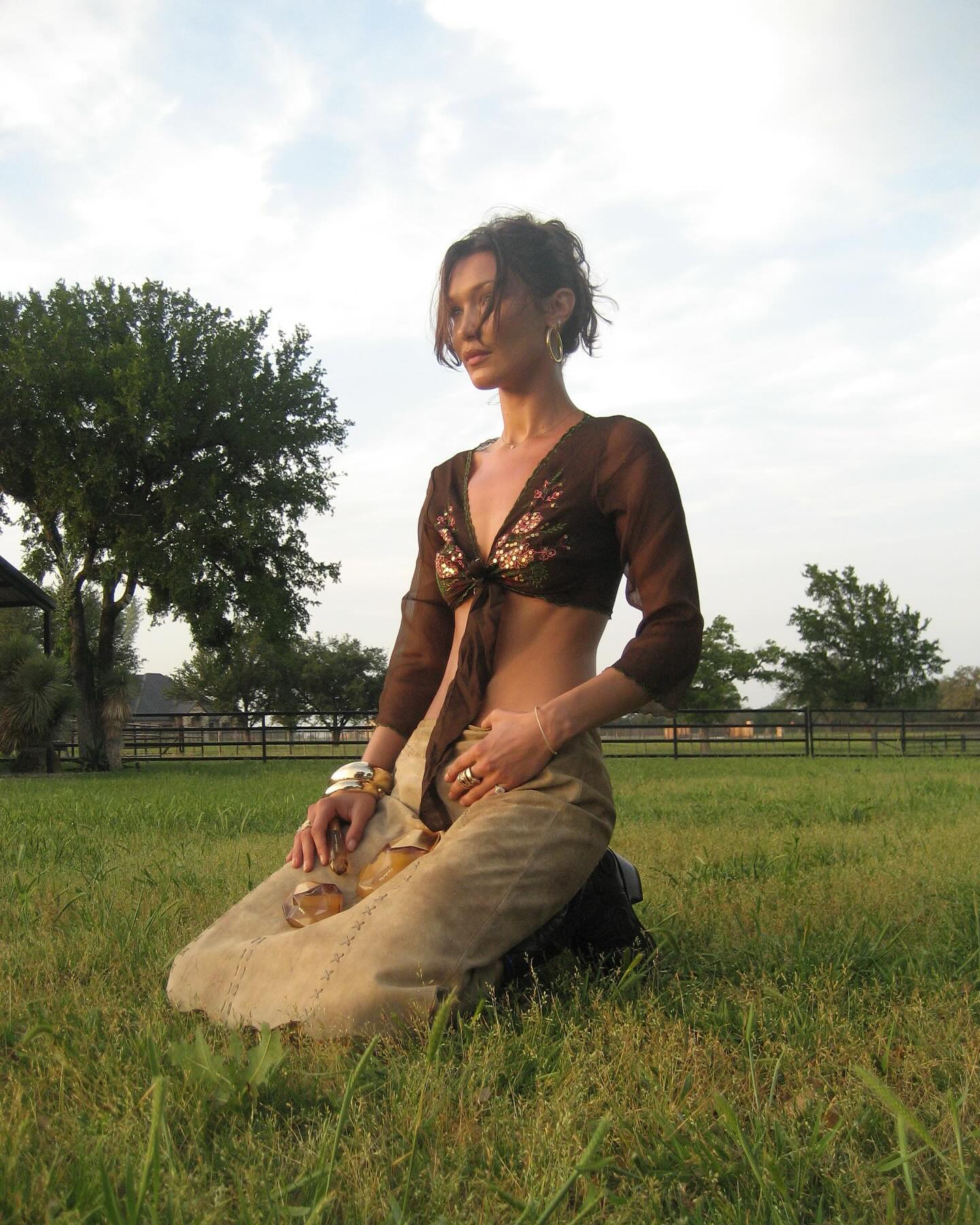 American fashion model Bella Hadid poses in the grass during a photoshoot for her new perfume in the first decade of May 2024. (Photo by bellahadid/Instagram)