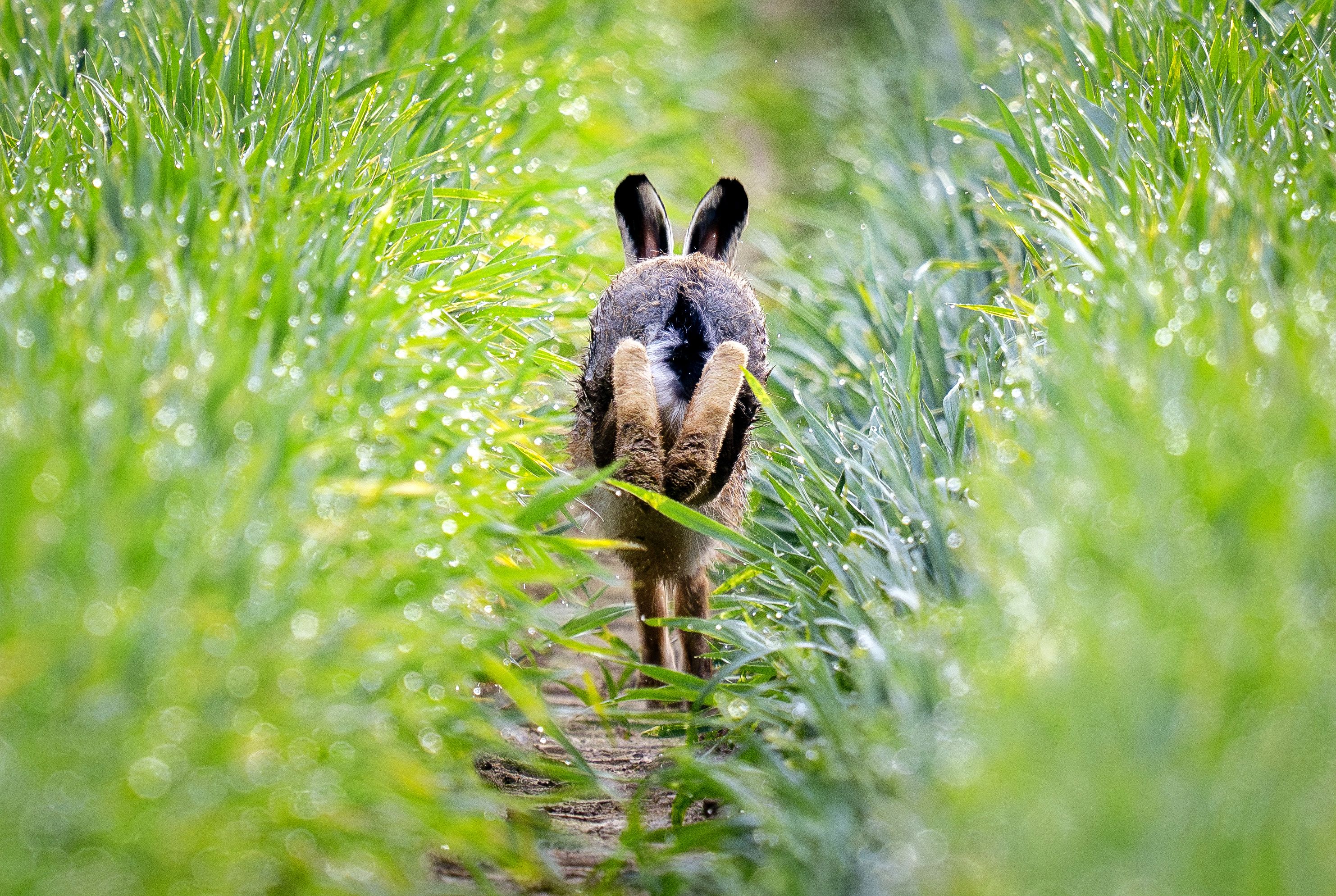 A hare runs in a field in the outskirts of Frankfurt, Germany, Monday, April 29, 2024. (Photo by Michael Probst/AP Photo)