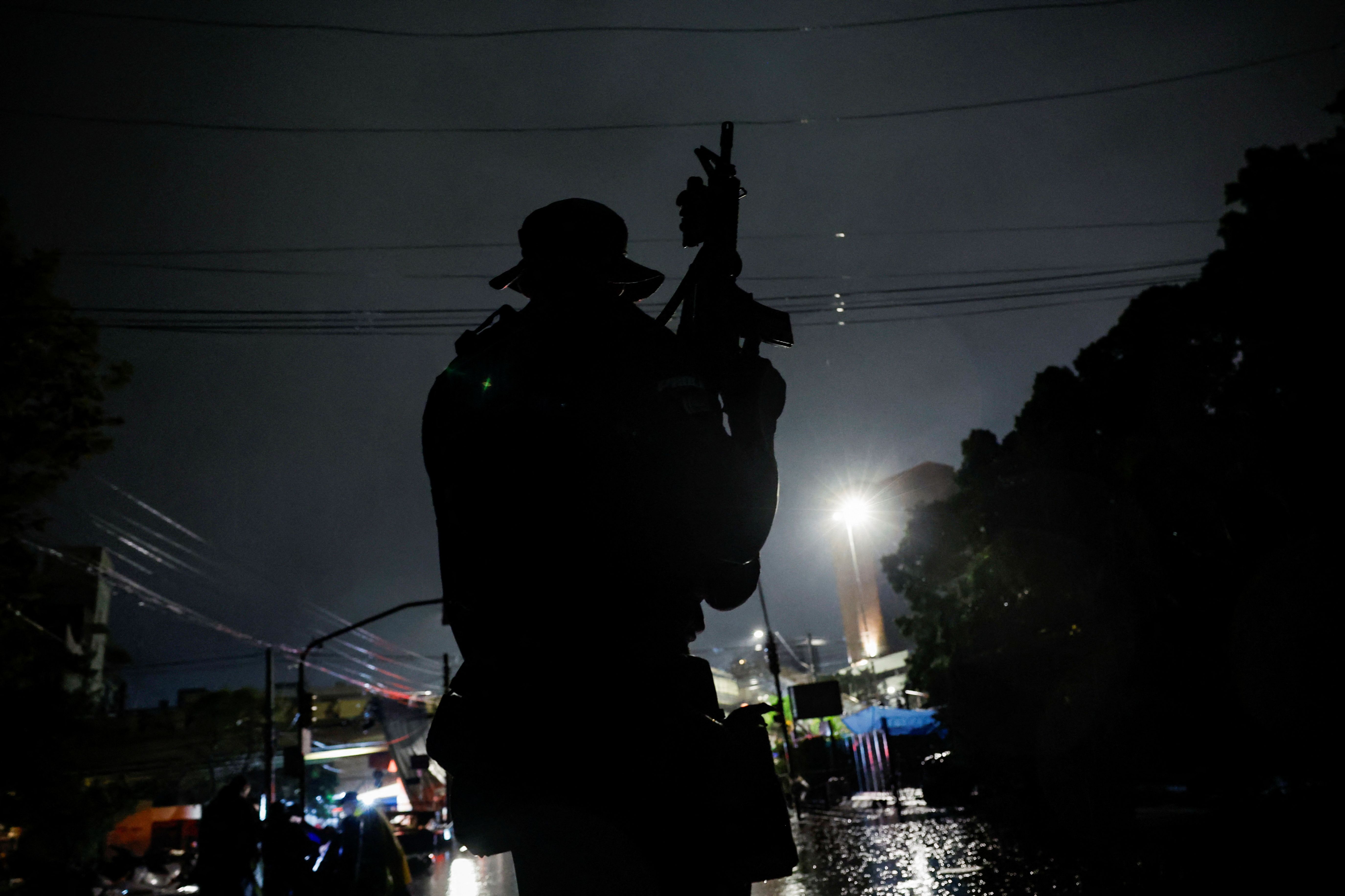 A police officer holds a rifle while patrolling on a boat in a flooded area to prevent theft in the downtown of Porto Alegre,Rio Grande do Sul state, Brazil on May 12, 2024. (Photo by Adriano Machado/Reuters)