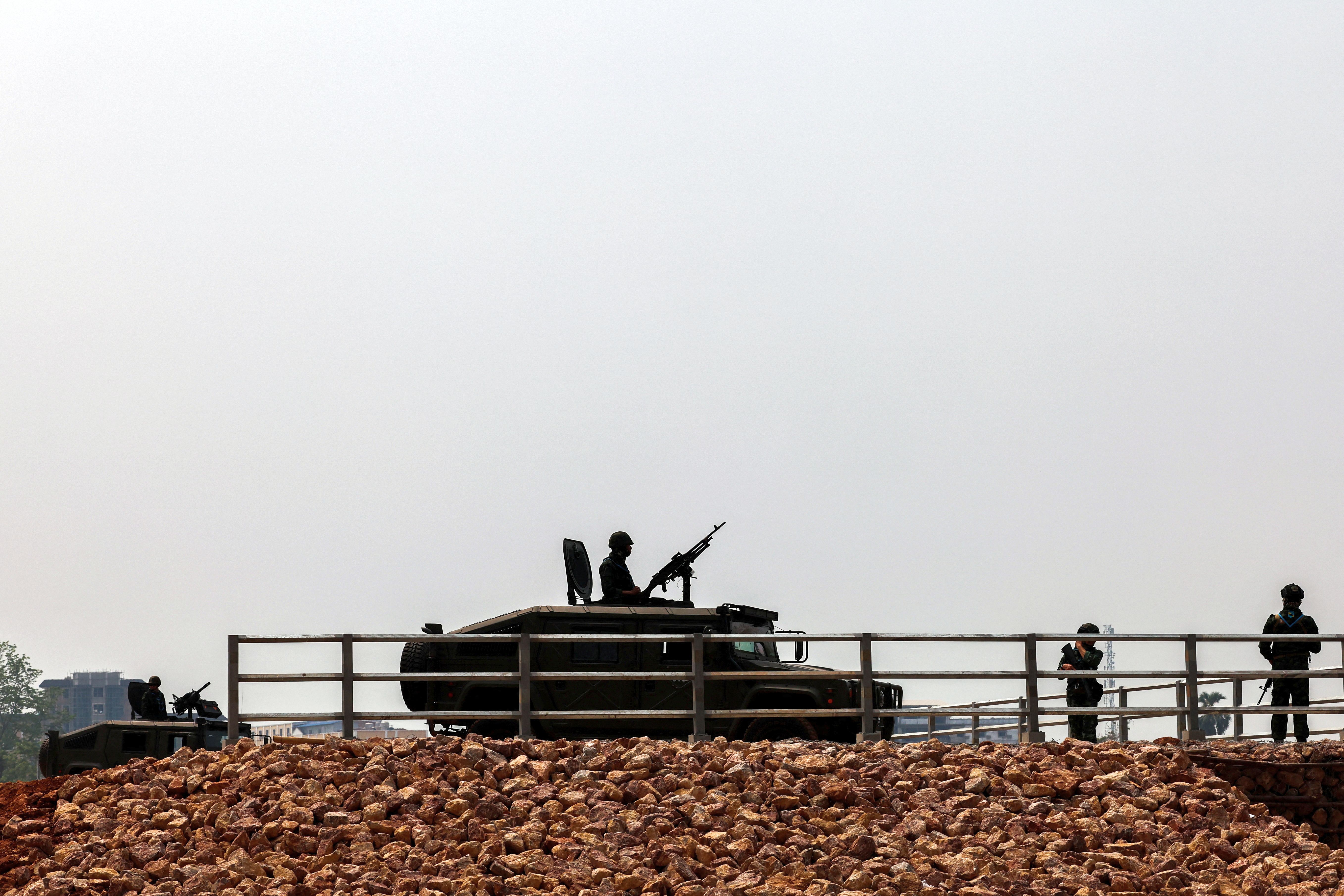 Military personnel stand guard, as a stream of people, some of them fearing air strikes, queued at a border crossing to flee Myanmar early on Friday, a day after the strategically-vital town of Myawaddy adjoining Thailand fell to anti-junta resistance that has been growing in strength, in Mae Sot, Tak province, Thailand, on April 12, 2024. (Photo by Athit Perawongmetha/Reuters)