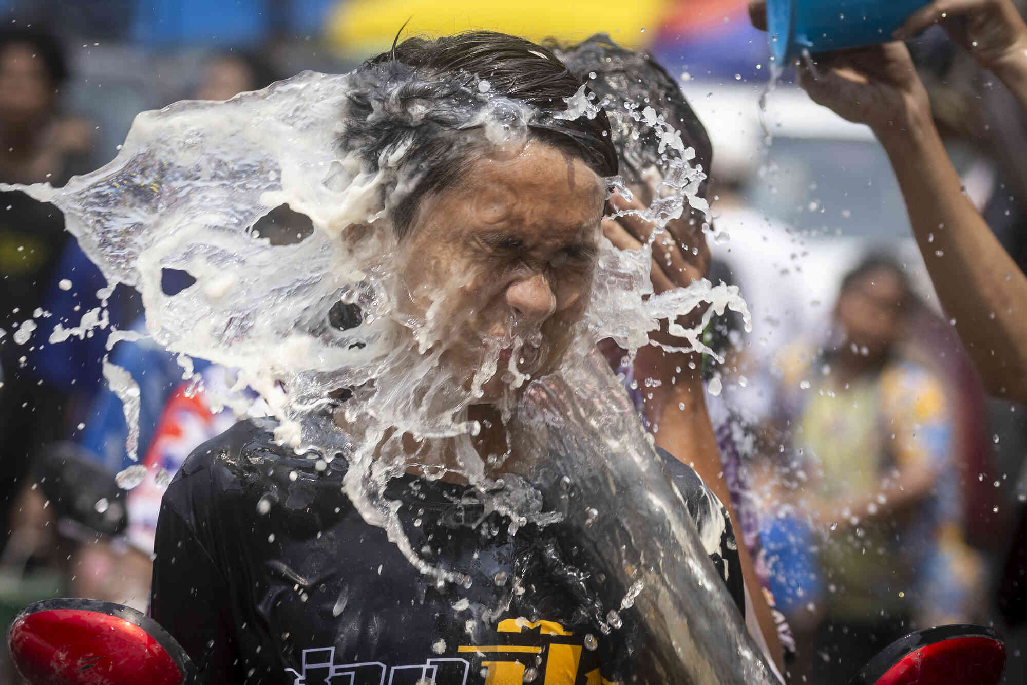 A man reacts as water is splashed on him during the Songkran water festival to celebrate the Thai New Year in Prachinburi Province, Saturday April 13, 2024. It's the time of year when many Southeast Asian countries hold nationwide water festivals to beat the seasonal heat, as celebrants splash friends, family and strangers alike in often raucous celebration to mark the traditional Theravada Buddhist New Year. (Photo by Wason Wanichakorn/AP Photo)