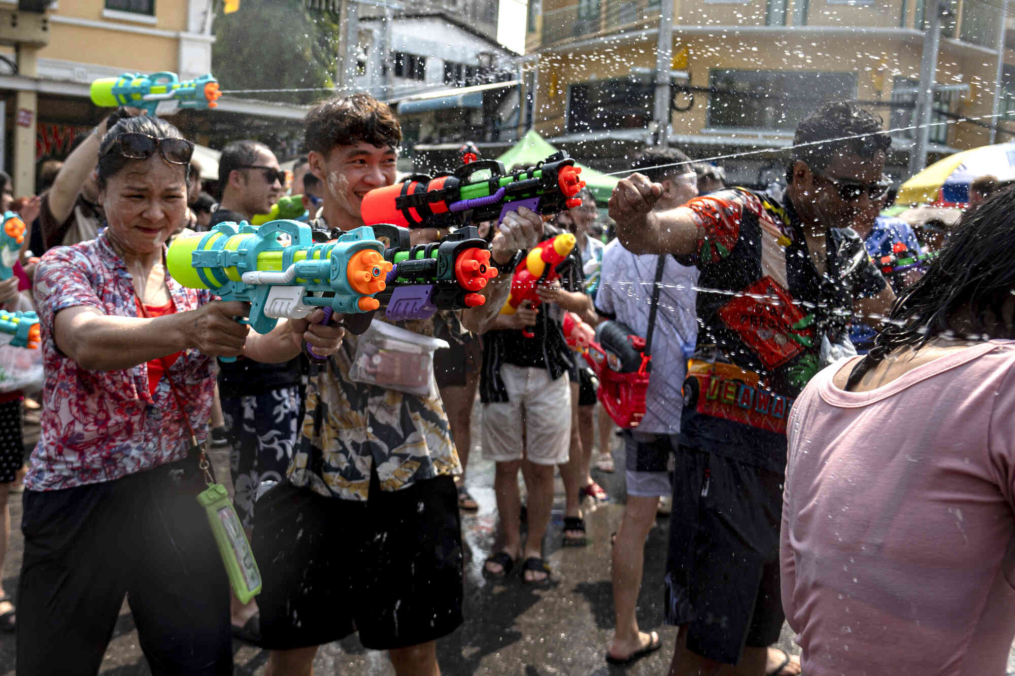 Thai locals and tourists play with water guns during the Songkran water festival to celebrate the Thai New Year in Bangkok, Thailand, Saturday April 13, 2024. (Photo by Tananchai Keawsowattana/AP Photo)