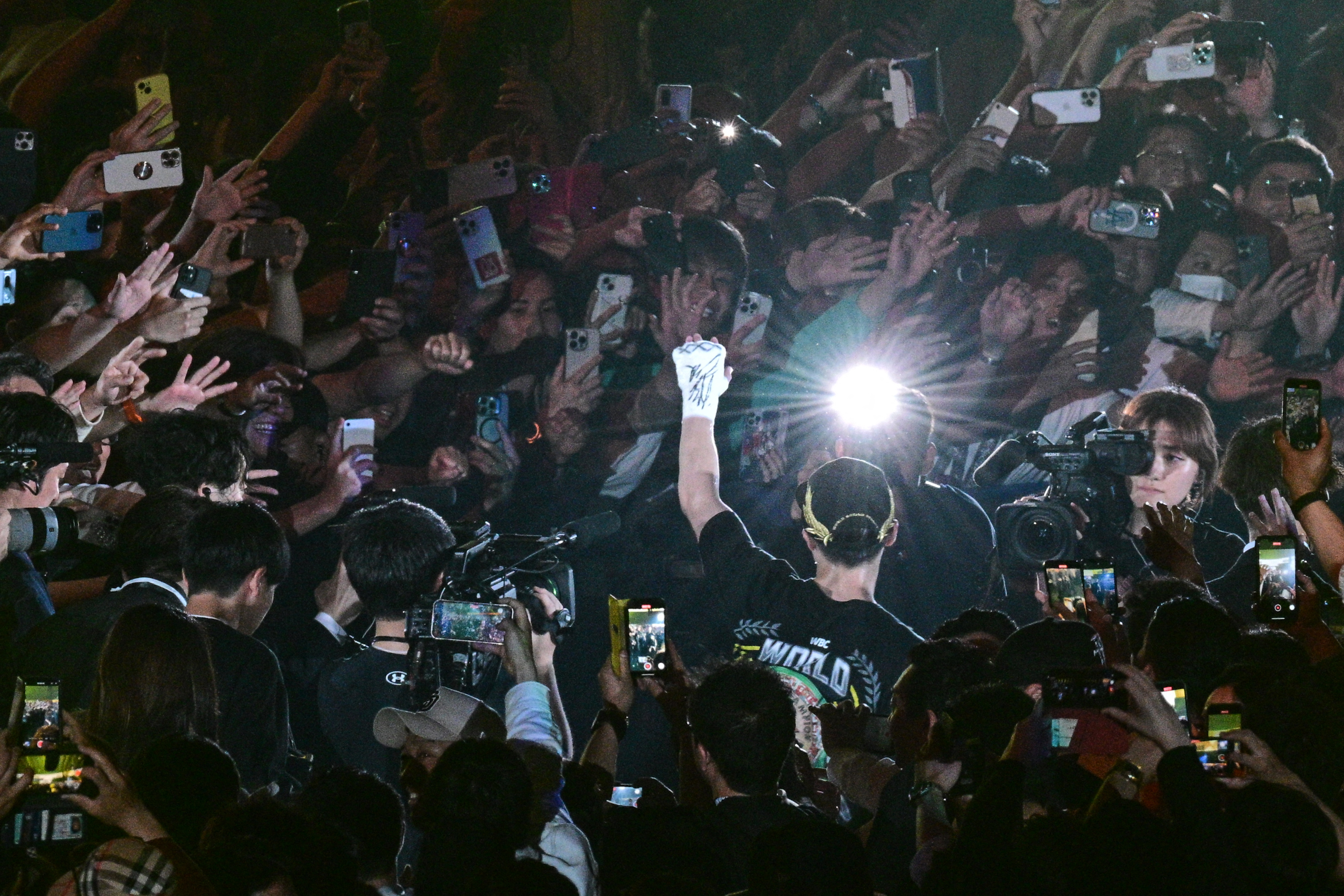 Japan’s Naoya Inoue (centre R) raises his arm as he celebrates his victory with the crowd after beating Mexico’s Luis Nery in their IBF-WBA-WBC-WBO super-bantamweight title boxing match at the Tokyo Dome in Tokyo on May 6, 2024. (Photo by Philip Fong/AFP Photo)
