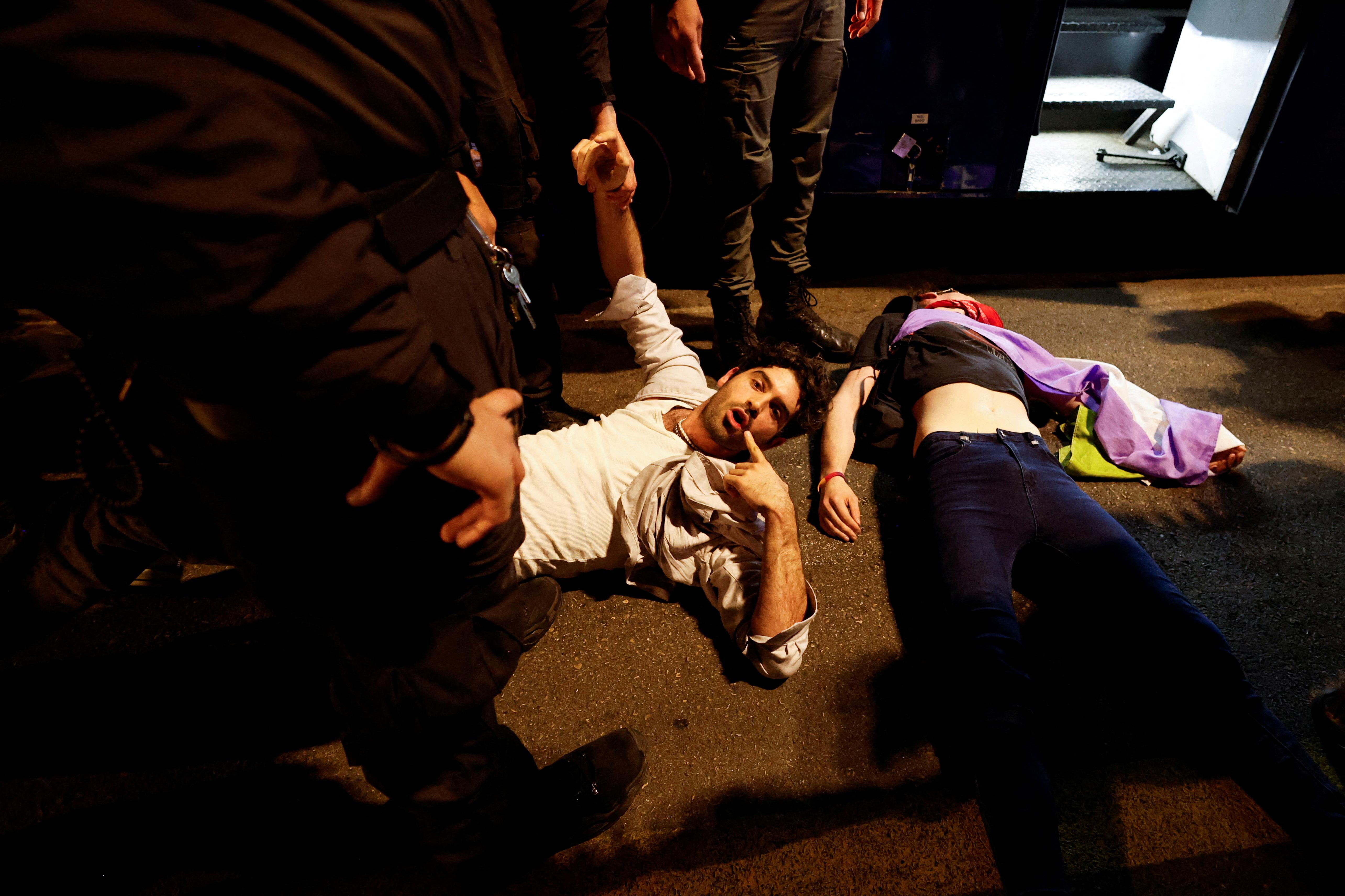 Police detain demonstrators during a protest against Israel's Prime Minister Benjamin Netanyahu's new right-wing coalition and its proposed judicial changes to reduce powers of the Supreme Court in Tel Aviv, Israel on February 25, 2023. (Photo by Ammar Awad/Reuters)
