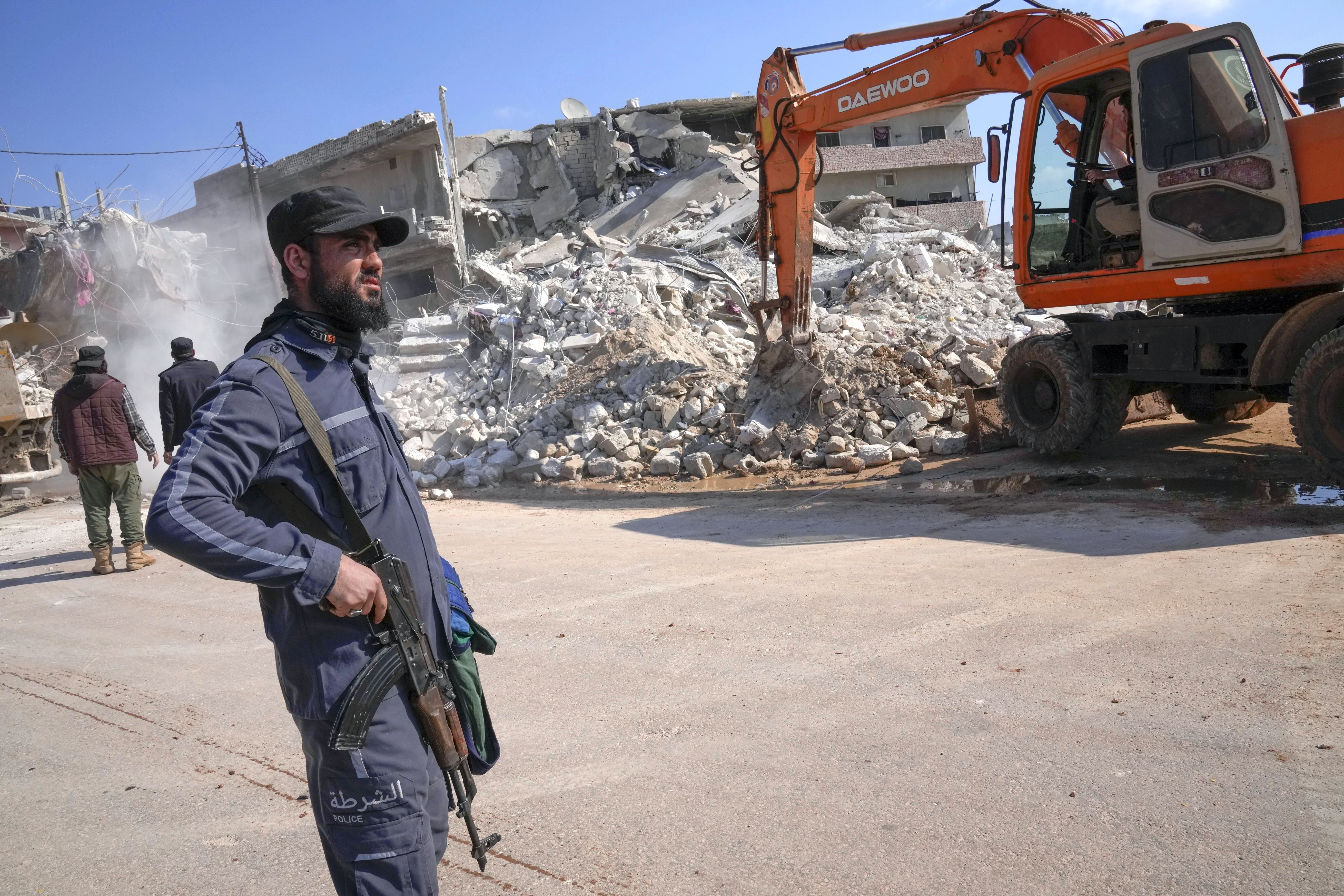 A militant of the al-Qaida-linked Hayat Tahrir al-Sham organisation stands in front of a destroyed house in Atareb, Syria, Sunday, February 12, 2023. Six days after a massive earthquake killed thousands in Syria and Turkey, sorrow and disbelief are turning to anger and tension over a sense that there has been an ineffective, unfair and disproportionate response to the historic disaster. (Photo by Hussein Malla/AP Photo)