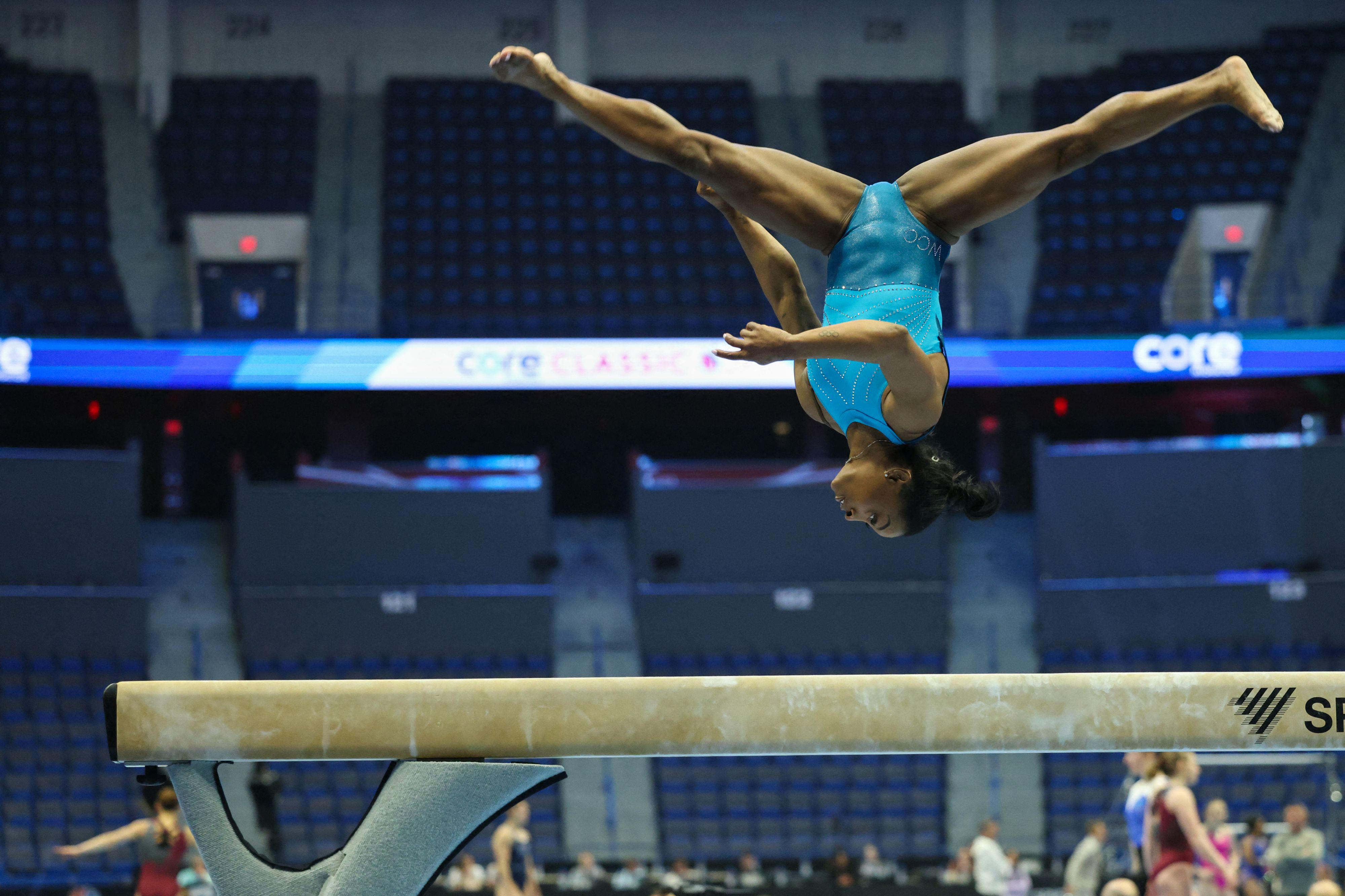 US gymnast Simone Biles trains at the XL Center ahead of the 2024 Core Hydration Classic in Hartford, Connecticut, May 17, 2024. (Photo by Charly Triballeau/AFP Photo)
