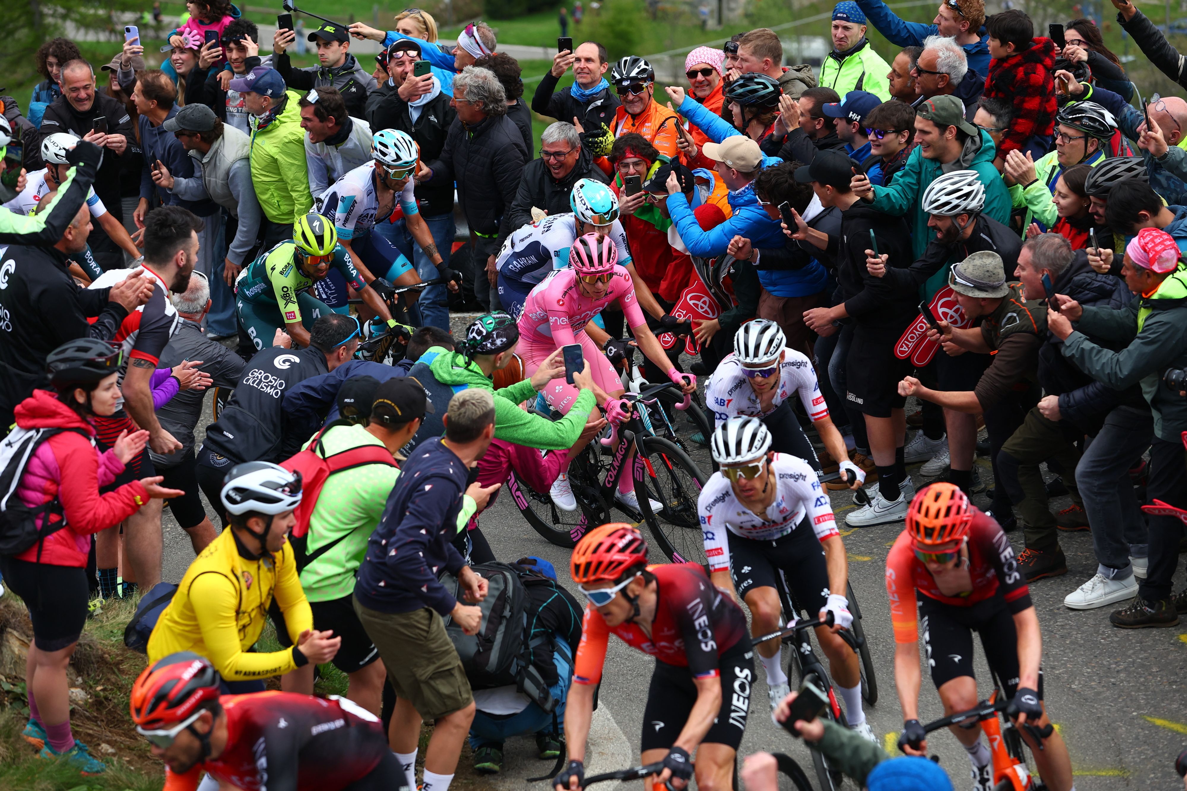 Pink jersey Team UAE's Slovenian rider Tadej Pogacar (C) climbs the Mortirolo section surrounded by fans during the 15th stage of the 107th Giro d'Italia cycling race, 222km between Manerba del Garda and Mottolino on May 19, 2024. (Photo by Luca Bettini/AFP Photo)