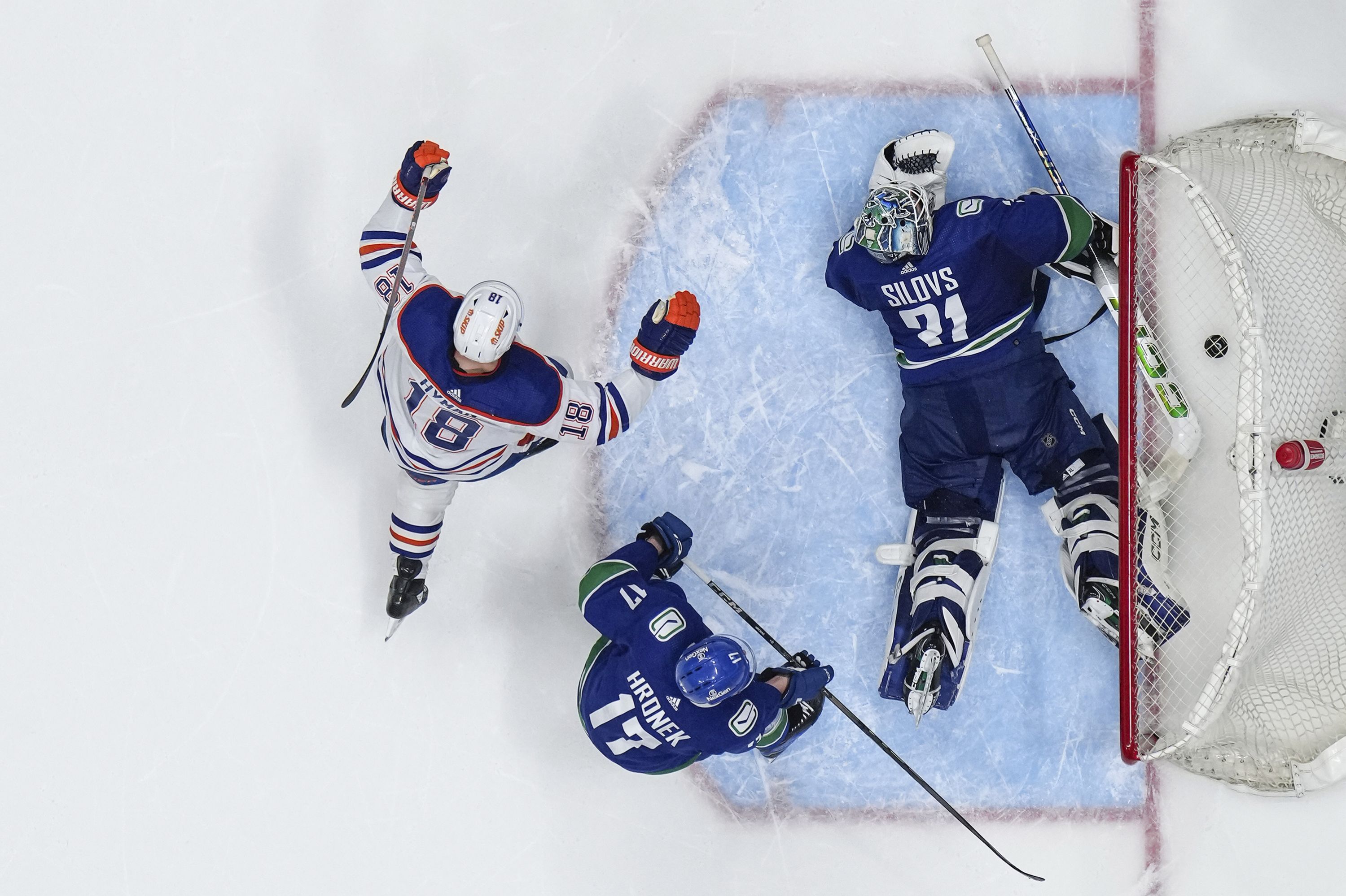 Edmonton Oilers' Zach Hyman (18) celebrates a goal by teammate Ryan Nugent-Hopkins, not pictured, against Vancouver Canucks goalie Arturs Silovs (31) as Filip Hronek (17) looks on during the second period in Game 7 of an NHL hockey Stanley Cup second-round playoff series, in Vancouver, British Columbia, Canada, on Monday, May 20, 2024. (Photo by Darryl Dyck/The Canadian Press via AP Photo)