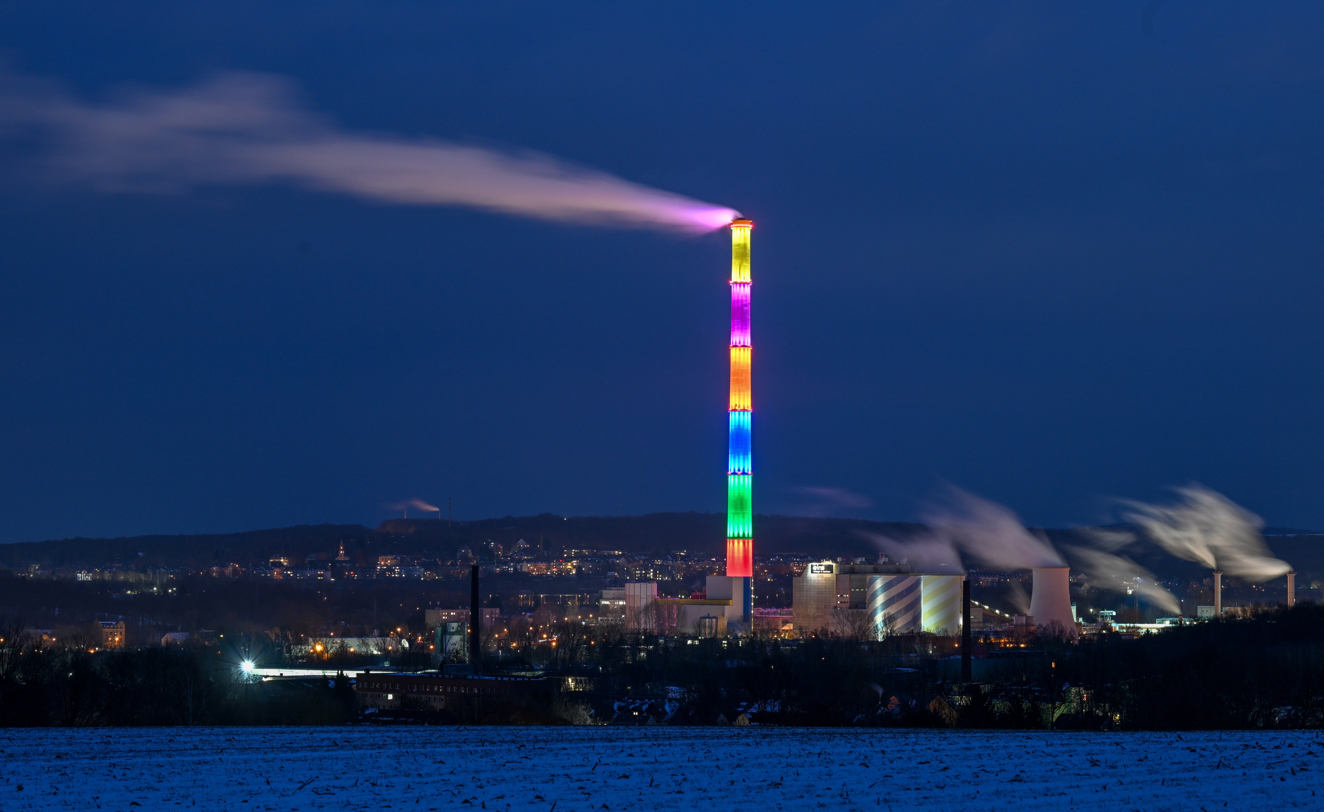 Smoke rises from the Chemnitz thermal power station in the second decade of January 2024 in Saxony, east Germany, which is about to be shut down. The 302m-high chimney, painted by the French artist Daniel Buren, will be preserved. (Photo by Hendrik Schmidt/Avalon)