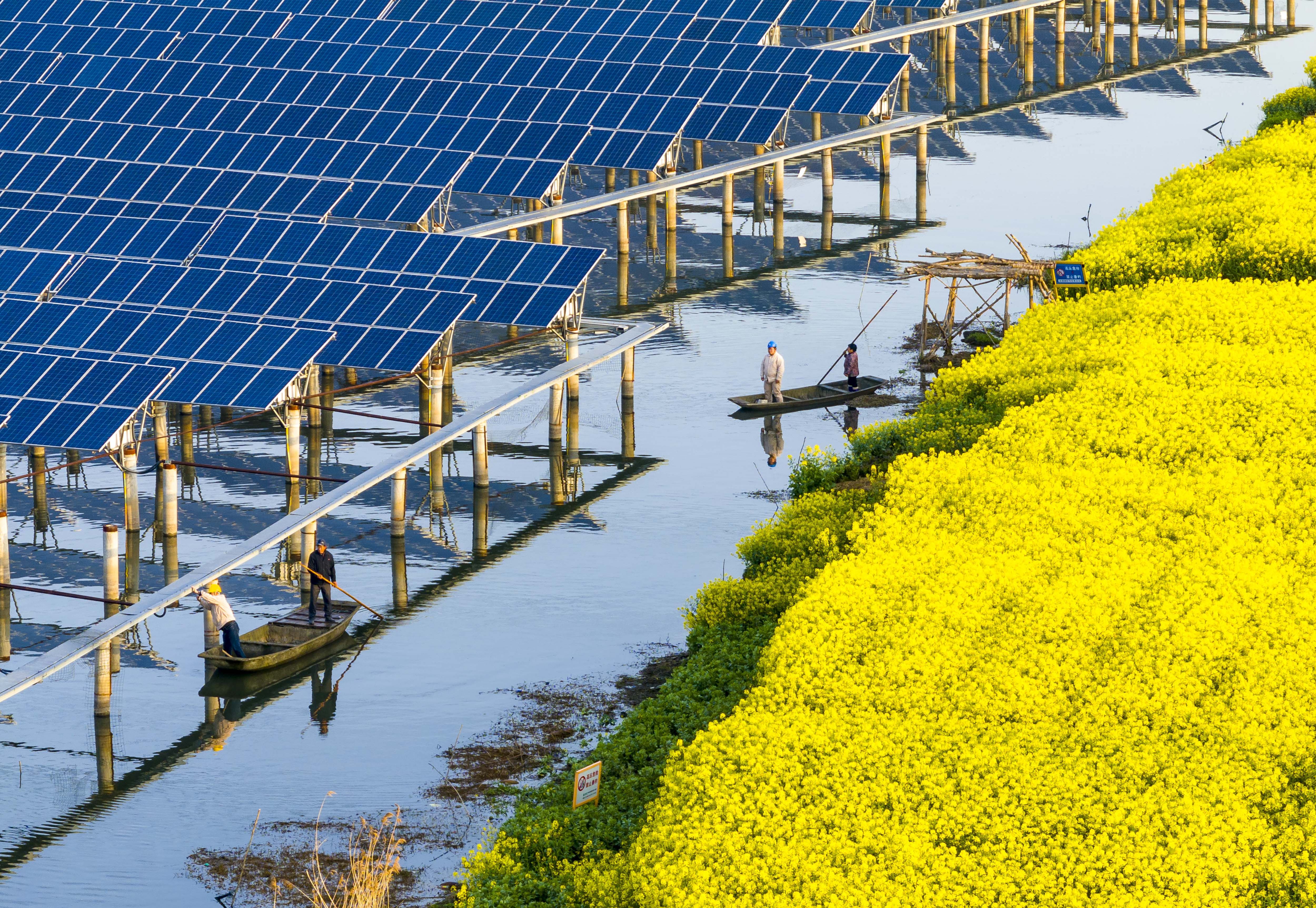 Staff from a power supply company are overhauling and maintaining photovoltaic equipment at the “fishery-solar hybrid project” photovoltaic power plant in Taizhou, Jiangsu Province, China, on March 29, 2024. (Photo by Costfoto/NurPhoto/Rex Features/Shutterstock)
