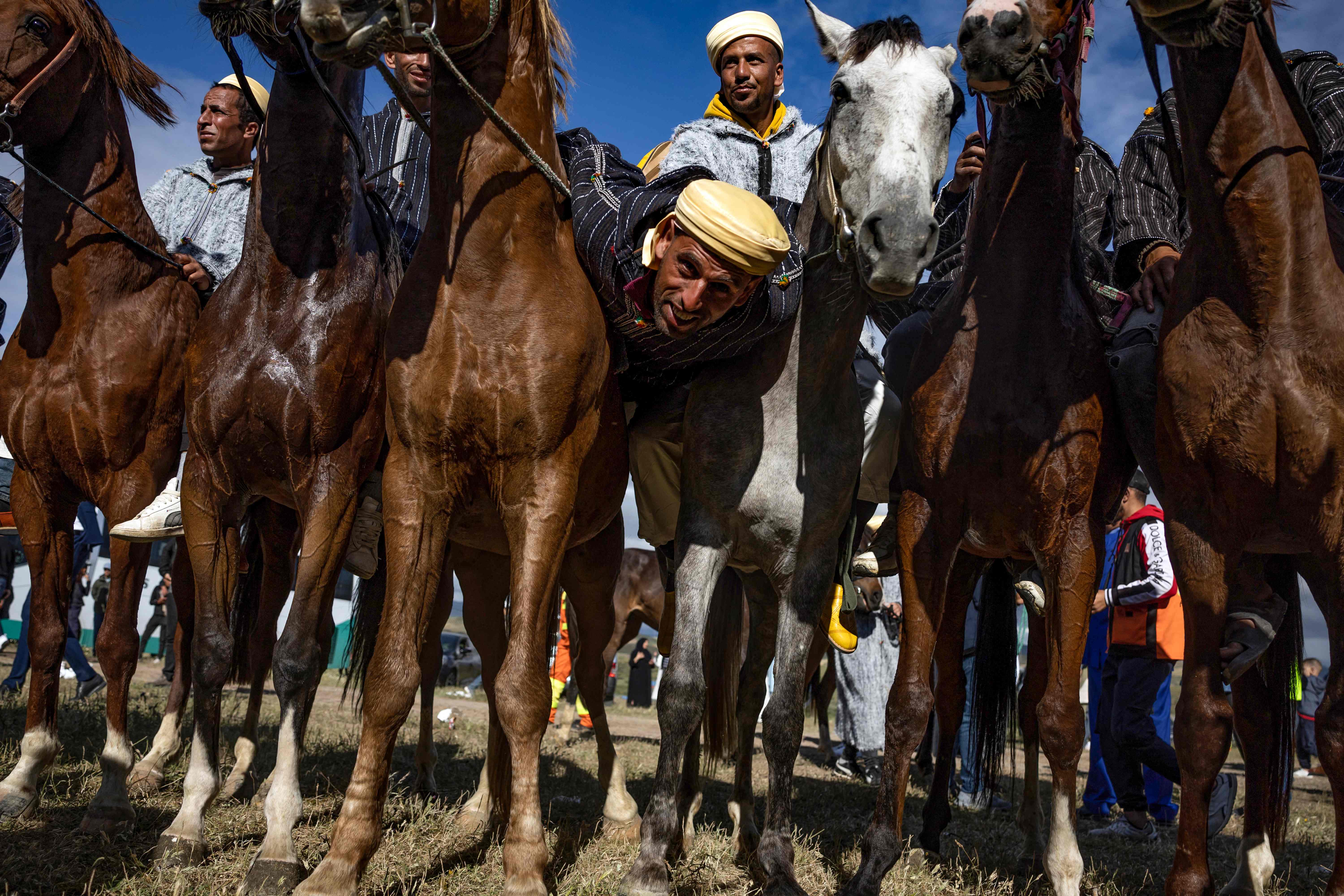 Riders from the Beni Arous tribe attend the traditional equestrian game and performance “Mata”, near the village of Znied in Morocco's Larache province on May 17, 2024. (Photo by Fadel Senna/AFP Photo)