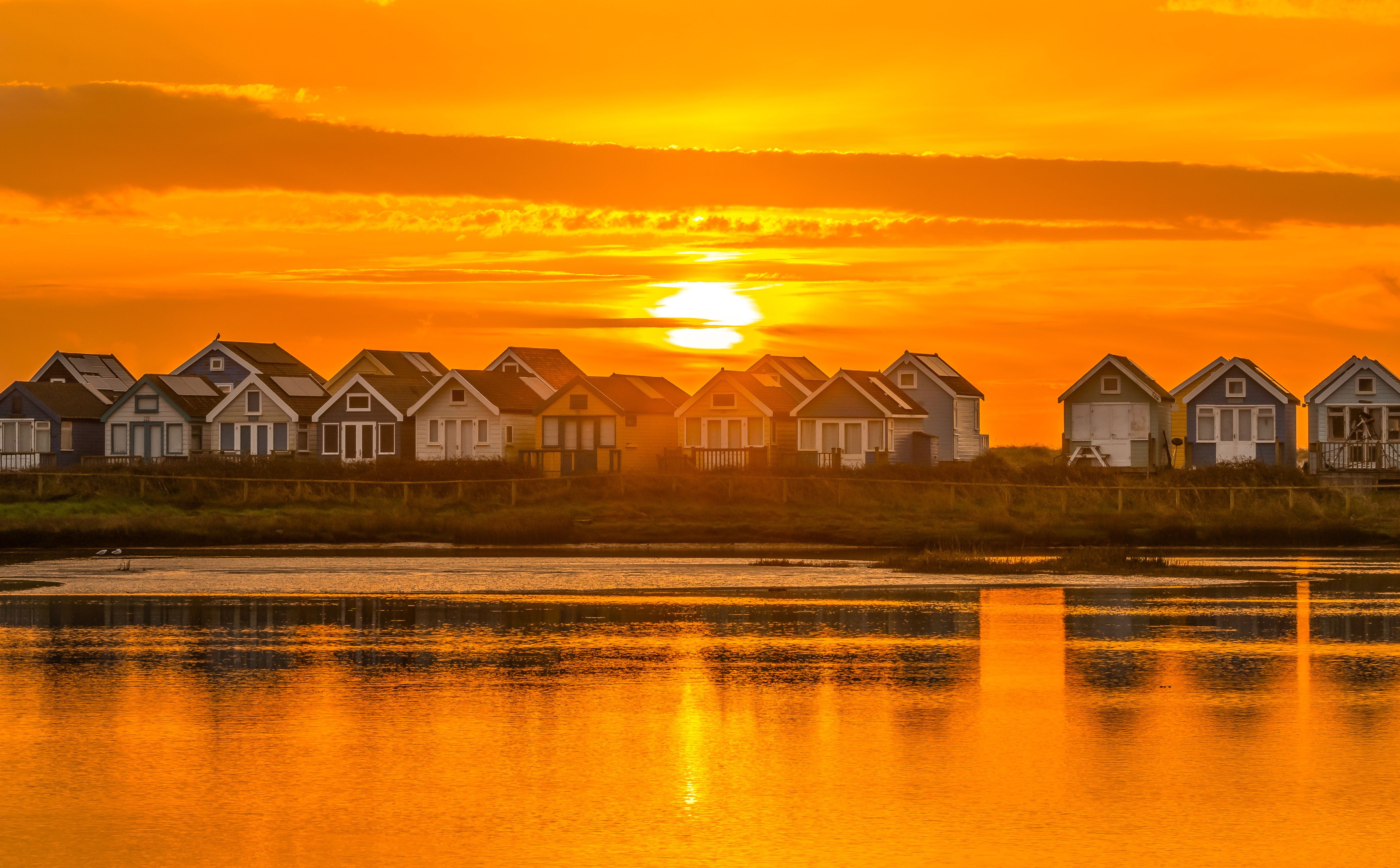 The sunrise above Mudeford beach huts in Dorset, UK with a colourful sky on March 14, 2024. There are about 360 wooden beach huts at Hengistbury Head, Mudeford Spit Sandbank. (Photo by Paul Jacobs/Picture Exclusive)