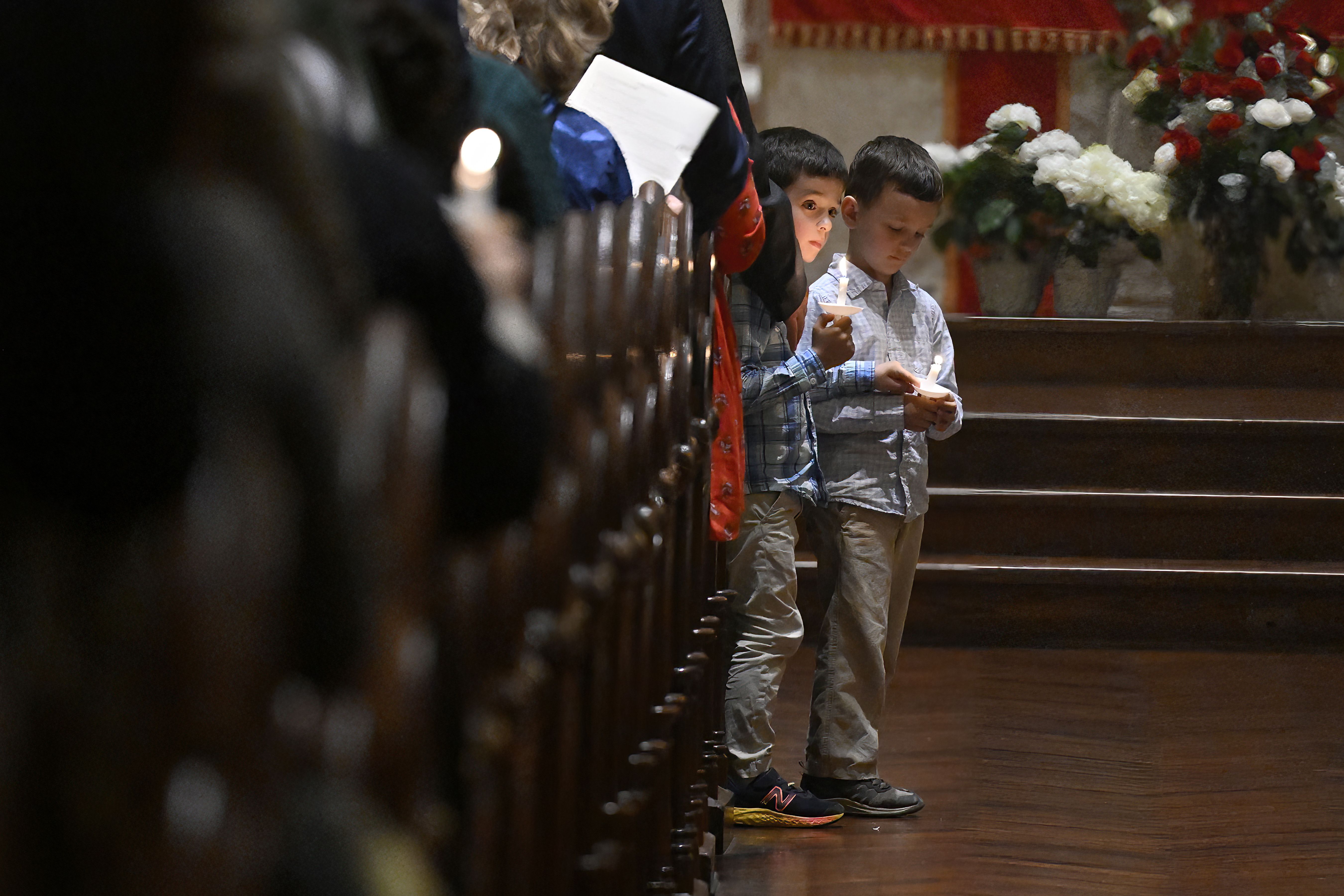 Two boys hold candles during a Pentecost Vigil at Blessed Michael McGivney Parish at St. Mary's Church, Saturday, May 18, 2024, in New Haven, Conn. The Eucharistic Procession from St. Mary's Church is one of four pilgrimage routes crossing the country and converging at the National Eucharistic Congress in Indianapolis, July 16. (Photo by Jessica Hill/AP Photo)