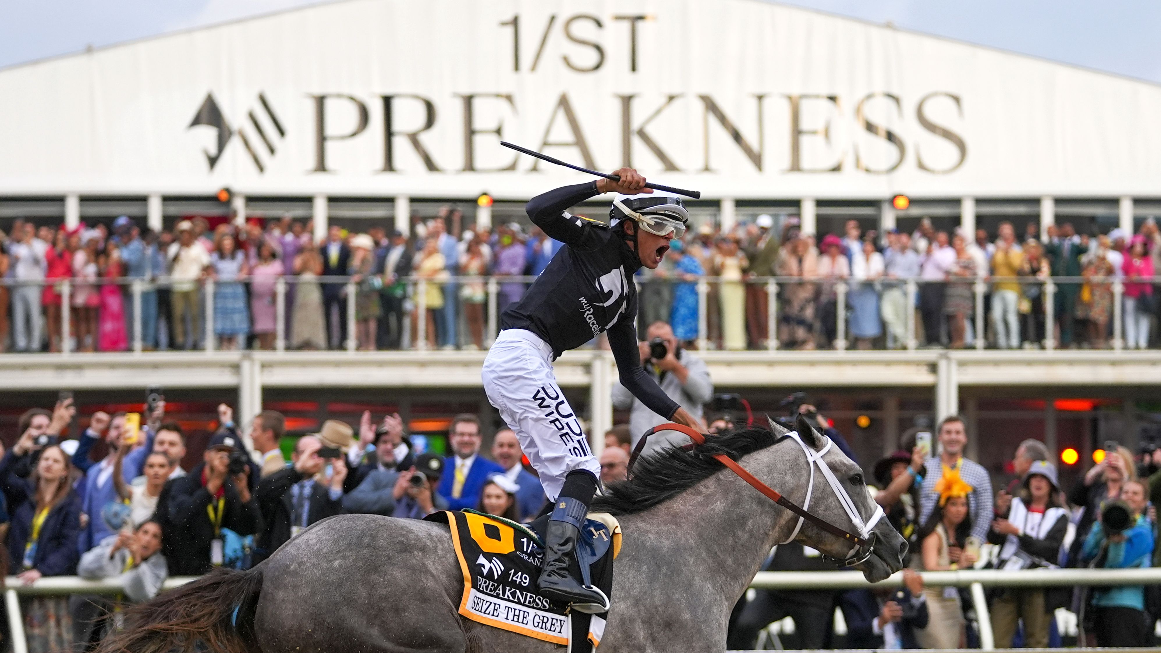 Jaime Torres, atop Seize The Grey, reacts after crossing the finish line to win the Preakness Stakes horse race at Pimlico Race Course, Saturday, May 18, 2024, in Baltimore. (Photo by Julio Cortez/AP Photo)