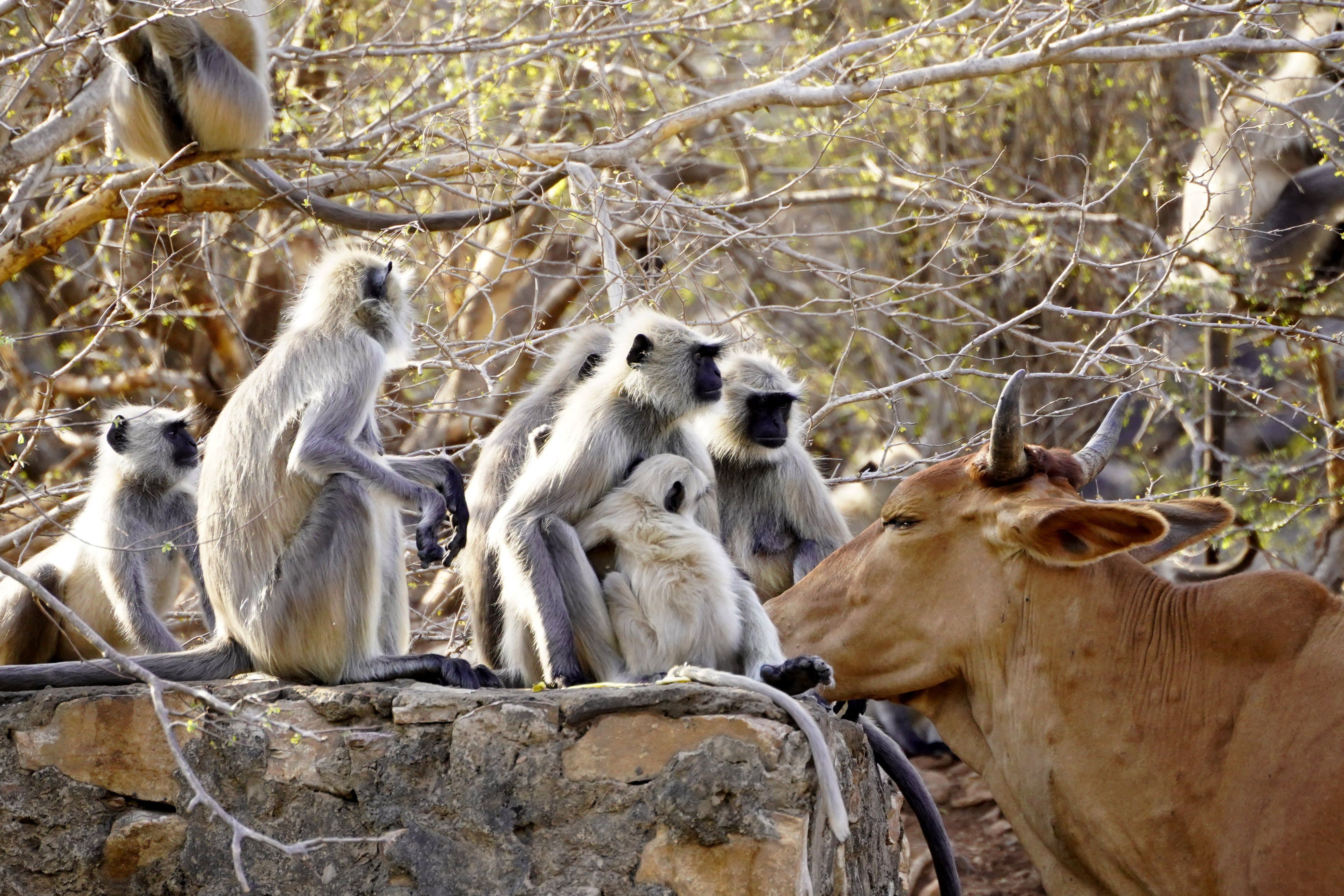 A cow checks to see if langur monkeys have any interesting food in Pushkar, India on 12 May 2024. (Photo by ABACA Press/Rex Features/Shutterstock)