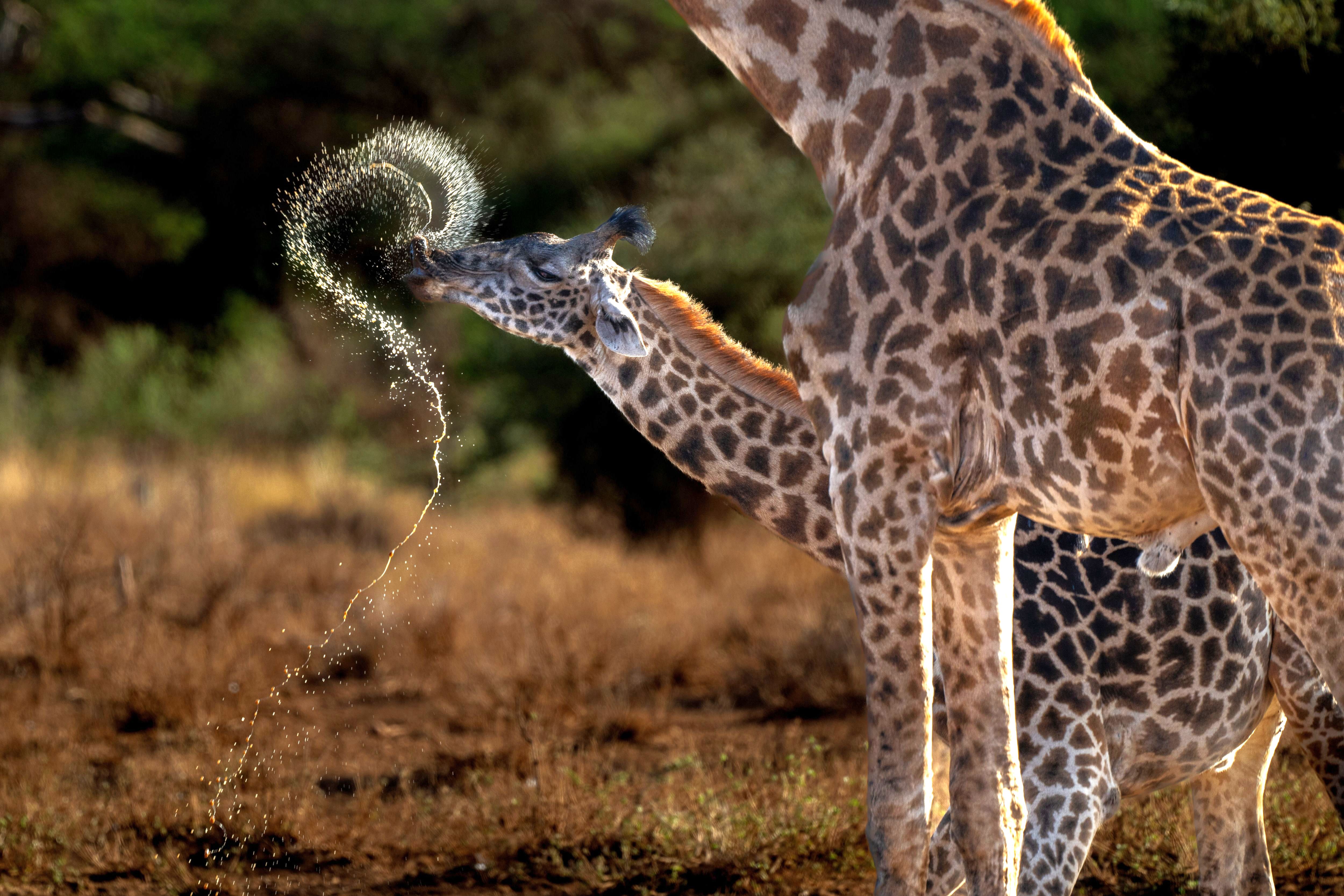 A baby giraffe splashes around while taking a drink from a watering hole at the Amboseli National Park in Kenya, 2024. The calf, which is just a few months old, is just over 6ft tall and weighs 147 pounds. Within a year, the baby can expect to grow to a height of 16-18ft and a weight of 1,500 pounds. (Photo by Michelle Guillermin/Media