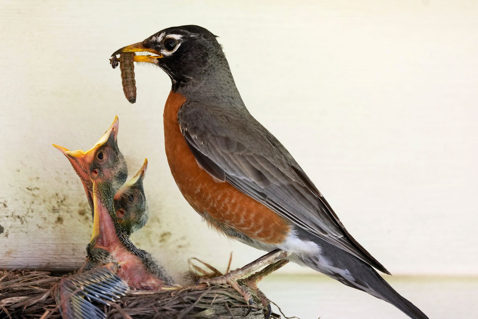 An American Robin feeds its babies in a backyard nest, Tuesday, May 14, 2024, in Urbandale, Iowa. (Photo by Charlie Neibergall/AP Photo)