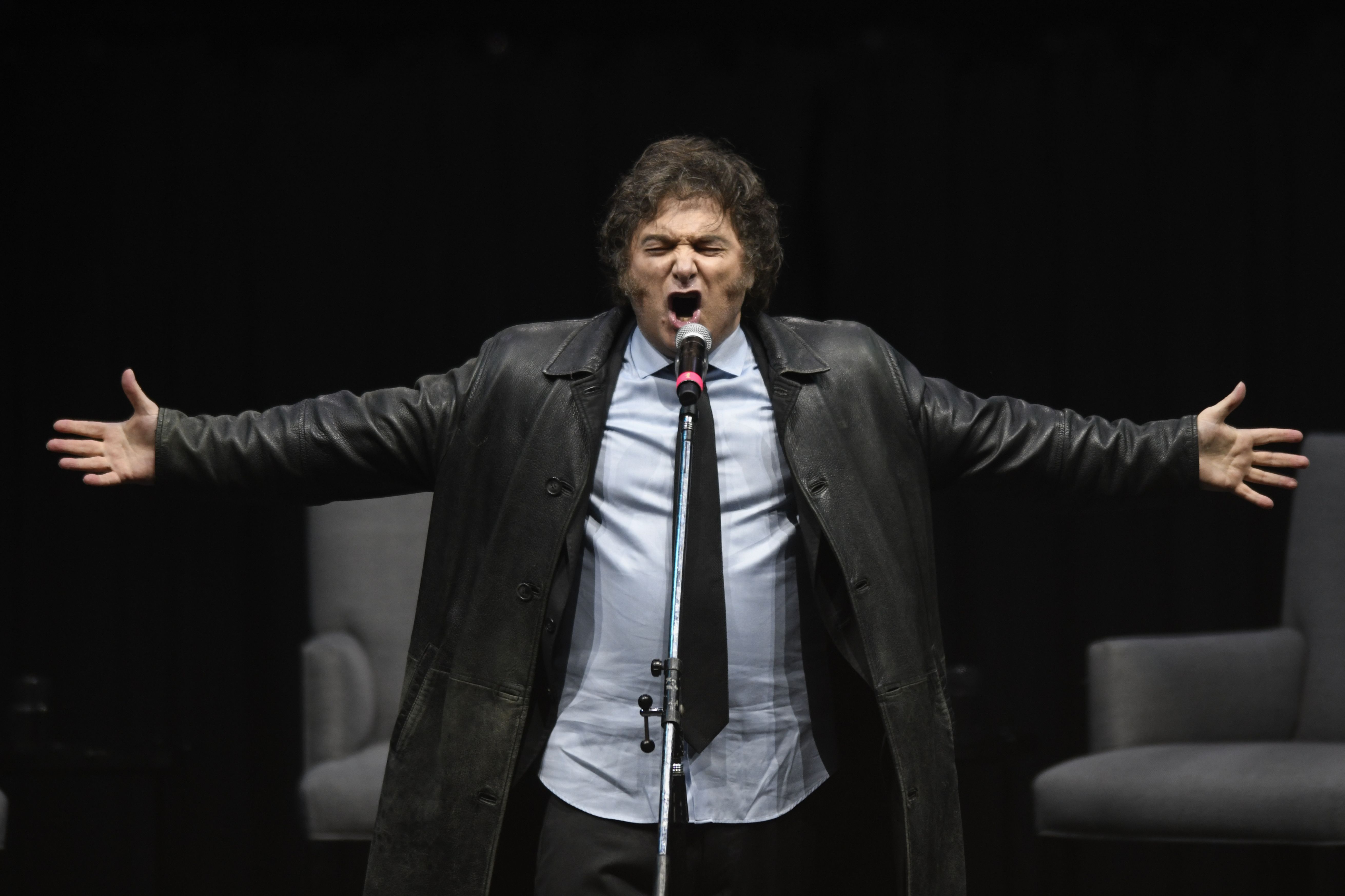 Argentine President Javier Milei sings at a promotional event for his new book in Buenos Aires, Argentina, May 22, 2024. (Photo by Gustavo Garello/AP Photo)