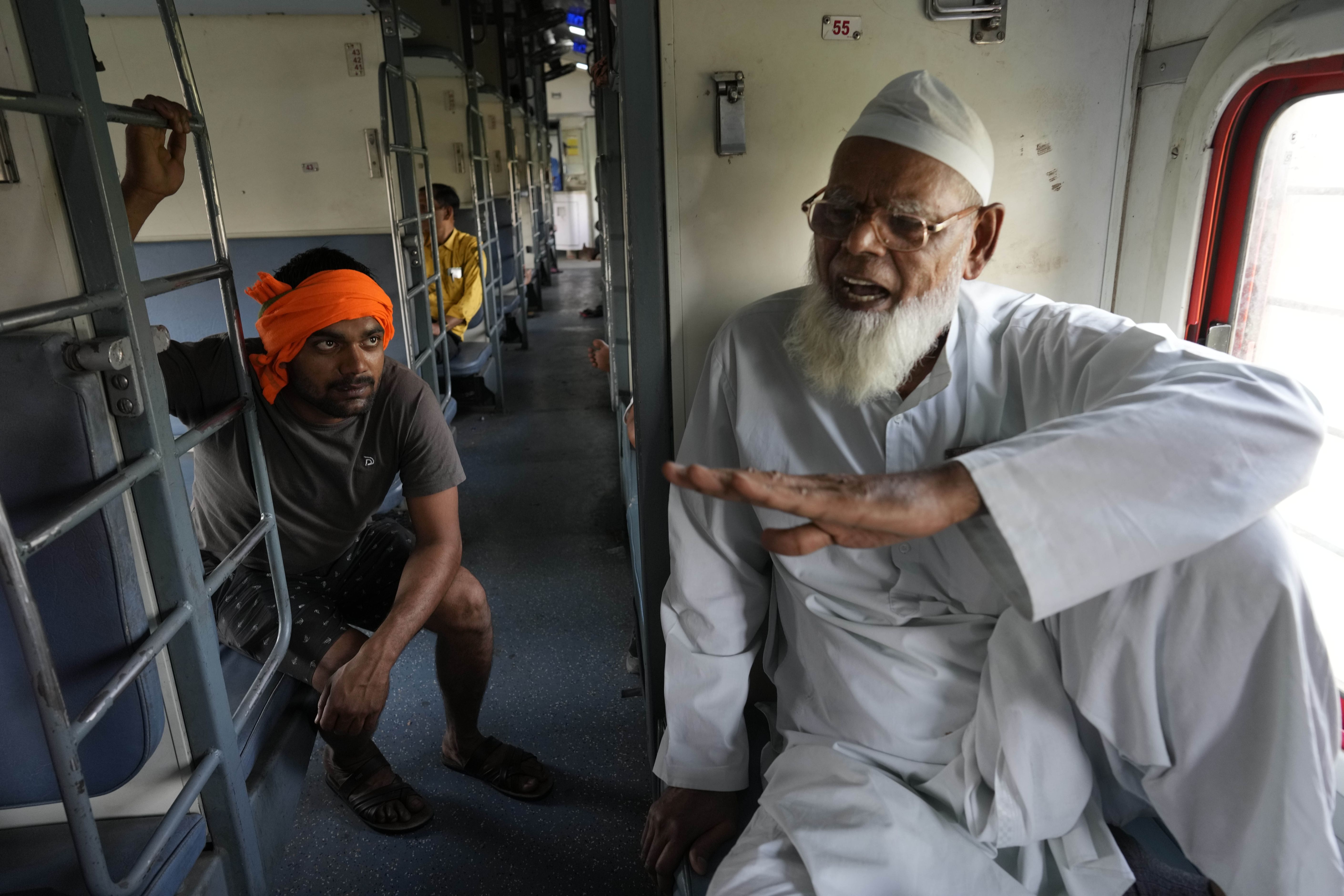 Haji Abdul Subhan, a 74-year-old former railway employee, speaks while travelling in the Thirukkural Express, Saturday, April 20, 2024. (Photo by Manish Swarup/AP Photo)
