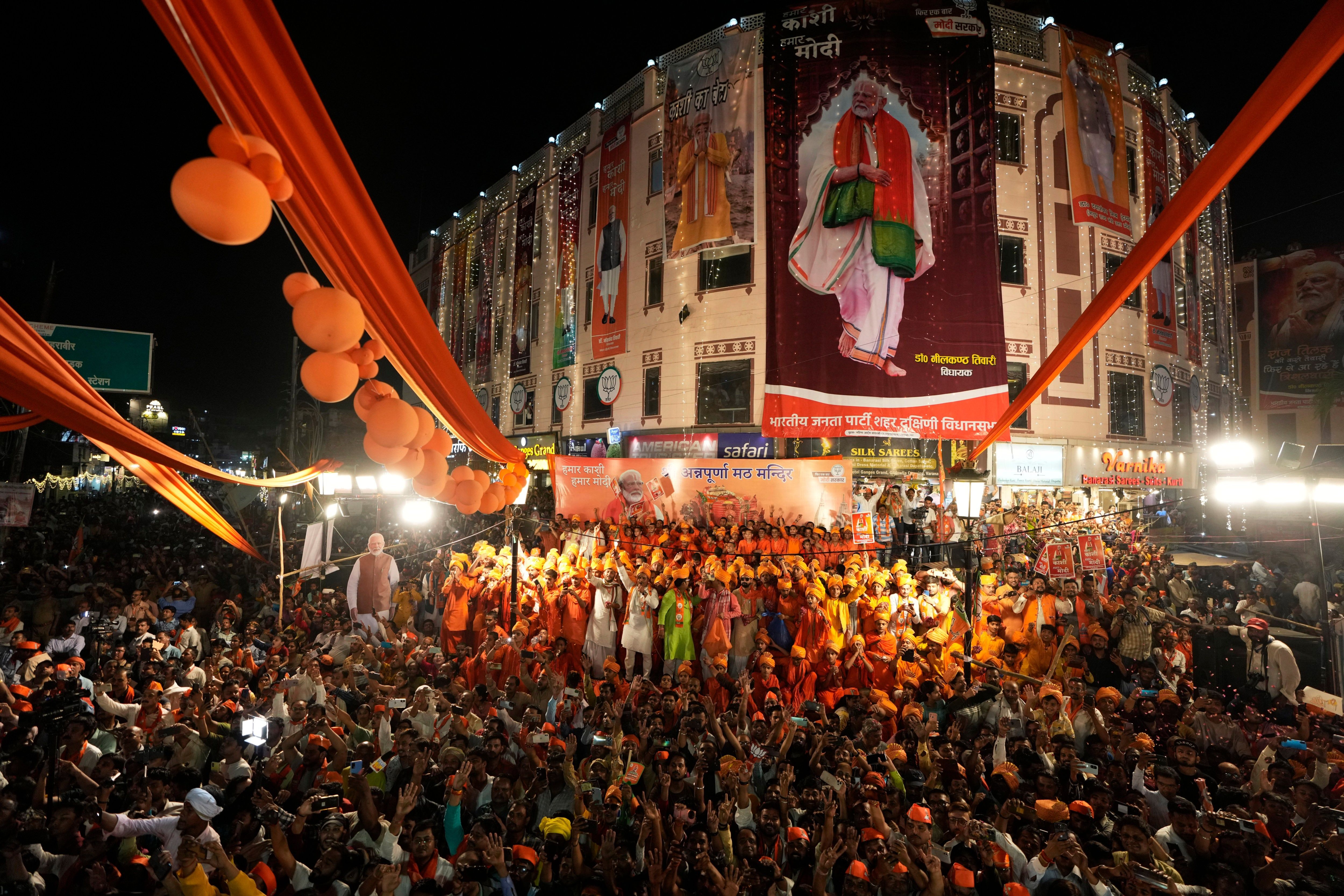 Supporters of Bharatiya Janata Party (BJP) gather to greet Indian Prime Minister Narendra Modi during a roadshow in Varanasi, India, Monday, May 13, 2024. (Photo by Rajesh Kumar Singh/AP Photo)