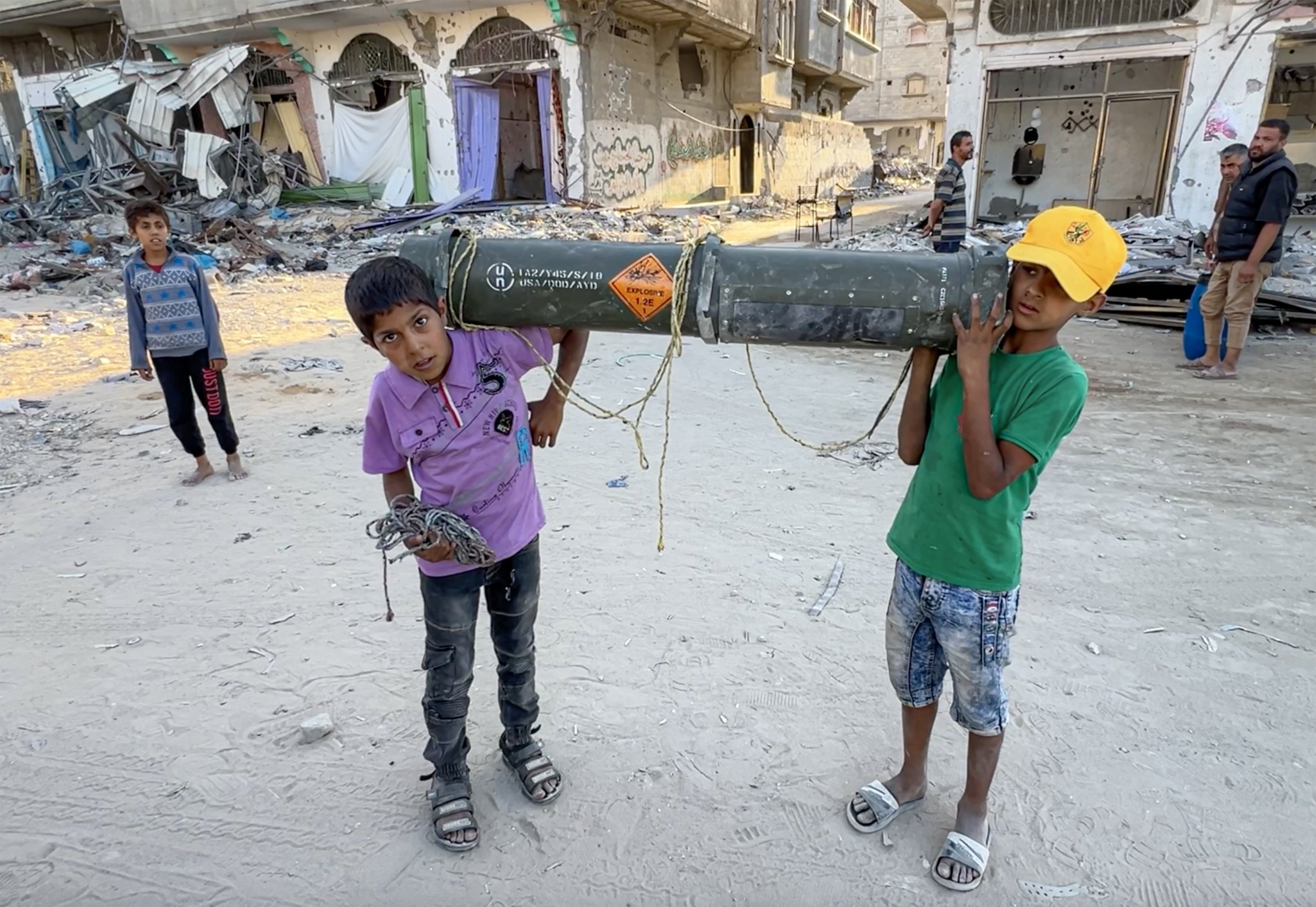 Children are seen playing with US-origin weapons and ammunition that were used by the Israeli Army in the ground operation following their withdrawal from Khan Yunis city where they carried out a ground attack for four months, in Khan Yunis, Gaza on May 16, 2024. Israeli media reported earlier on Sunday, April 7, that the Israeli army withdrew its 98th Division, with its three brigades from Khan Yunis. (Photo by Anas Zeyad Fteha/Anadolu via Getty Images)