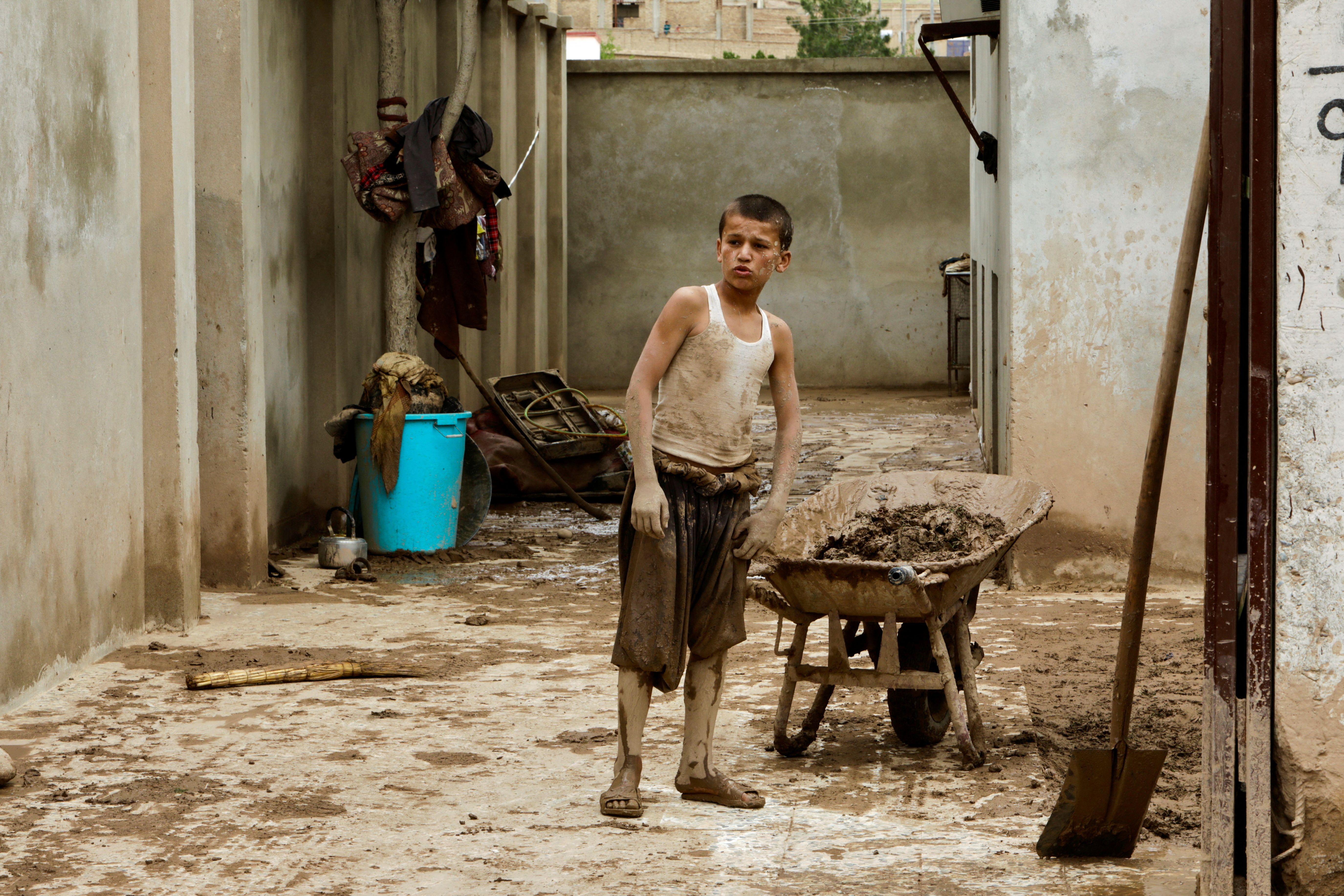 A boy looks on while standing next to a wheelbarrow, in the aftermath of floods following heavy rain, in Sheikh Jalal District, Baghlan province, Afghanistan on May 11, 2024. (Photo by Sayed Hassib/Reuters)