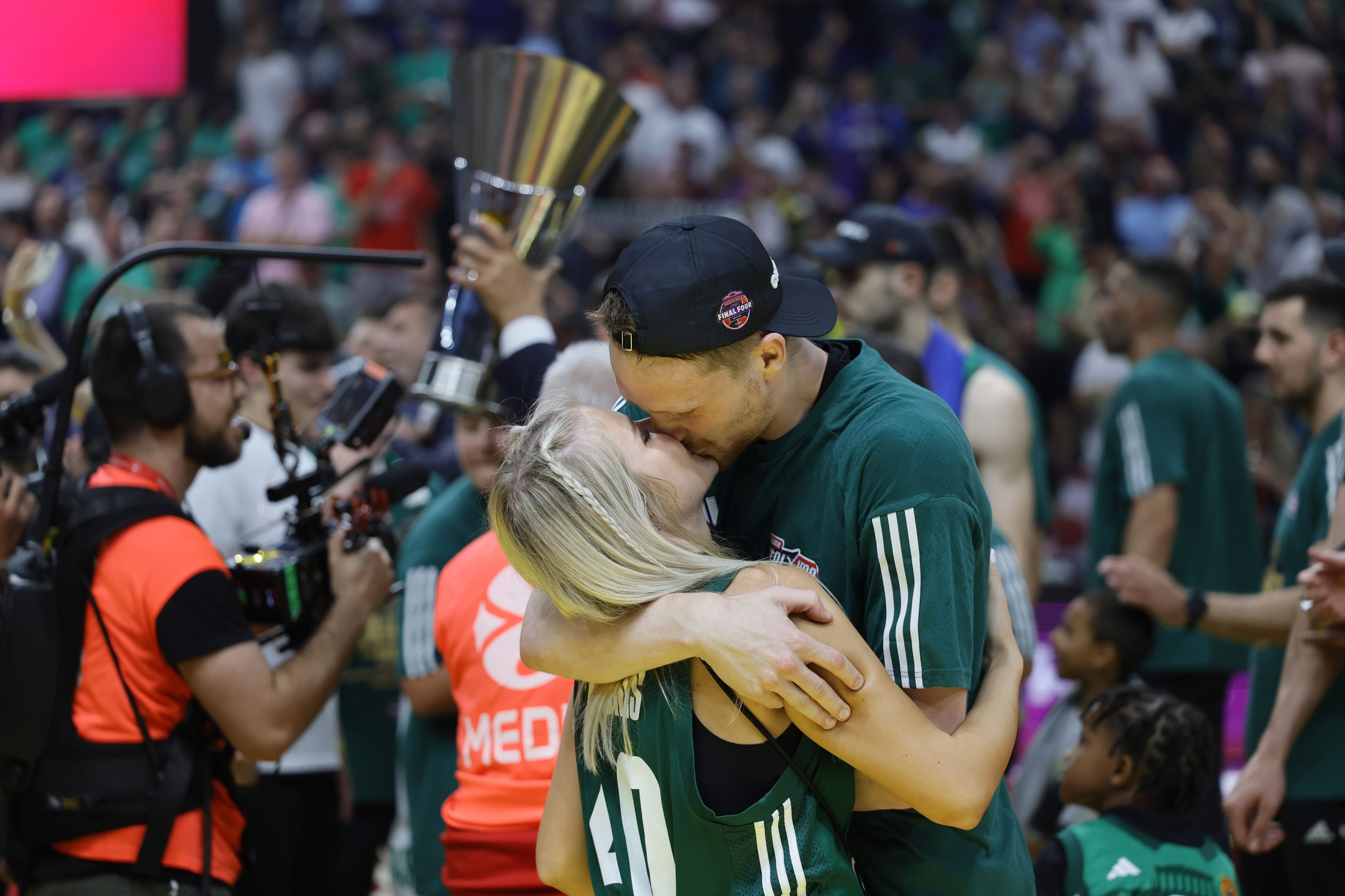 Panathinaikos' Marius Grigonis (R) celebrates with wife Salomeja Karvelyte (L) after winning the Euroleague Basketball final match between Real Madrid and Panathinaikos Athens in Berlin, Germany, 26 May 2024. (Photo by Ronald Wittek/EPA/EFE)