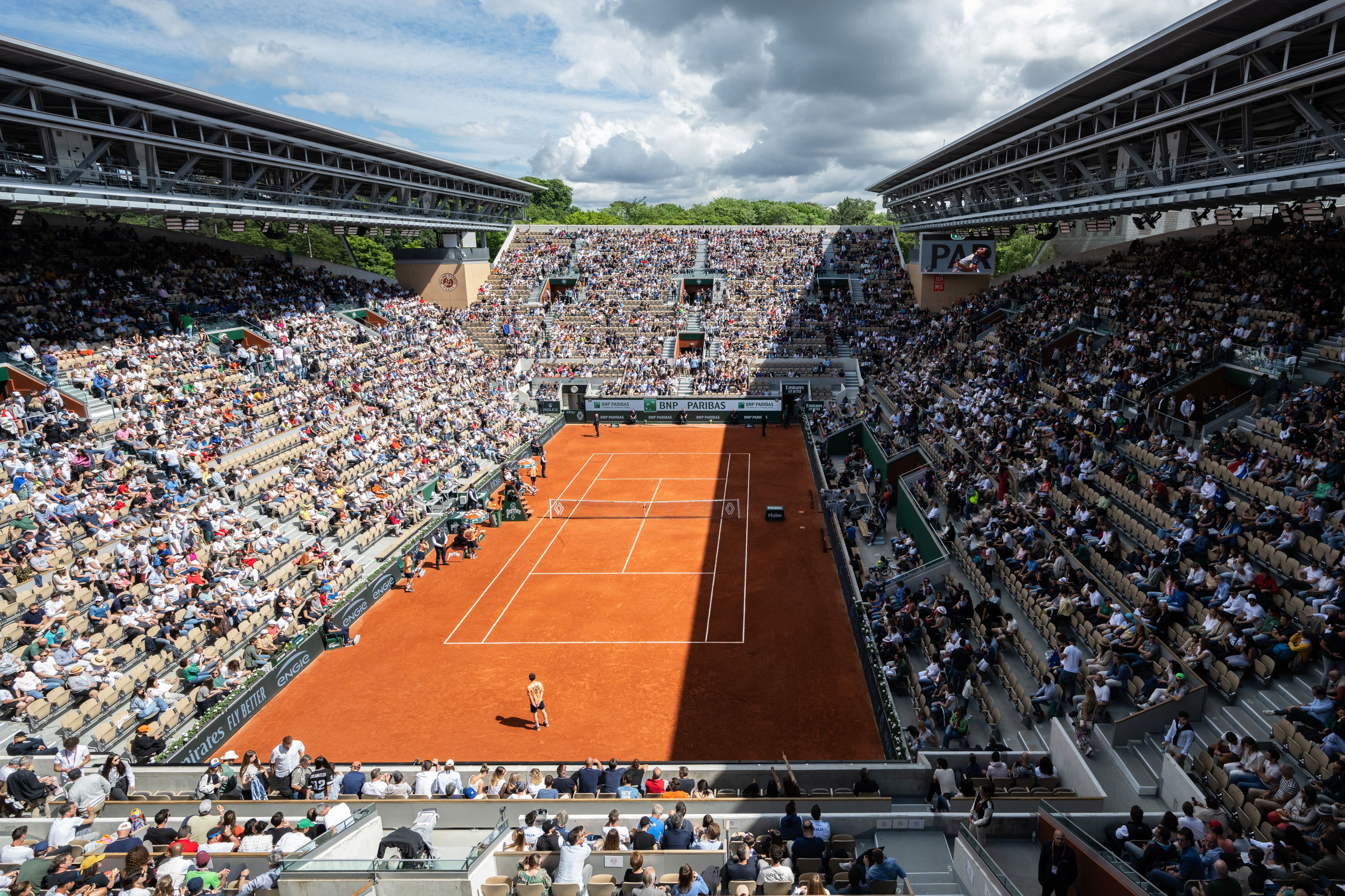 This photograph shows a view of Court Suzanne-Lenglen as France's Ugo Humbert and Italy's Lorenzo Sonego play their men's singles match on day one of The French Open tennis tournament at The Roland Garros Complex in Paris on May 26, 2024. (Photo by Bertrand Guay/AFP Photo)