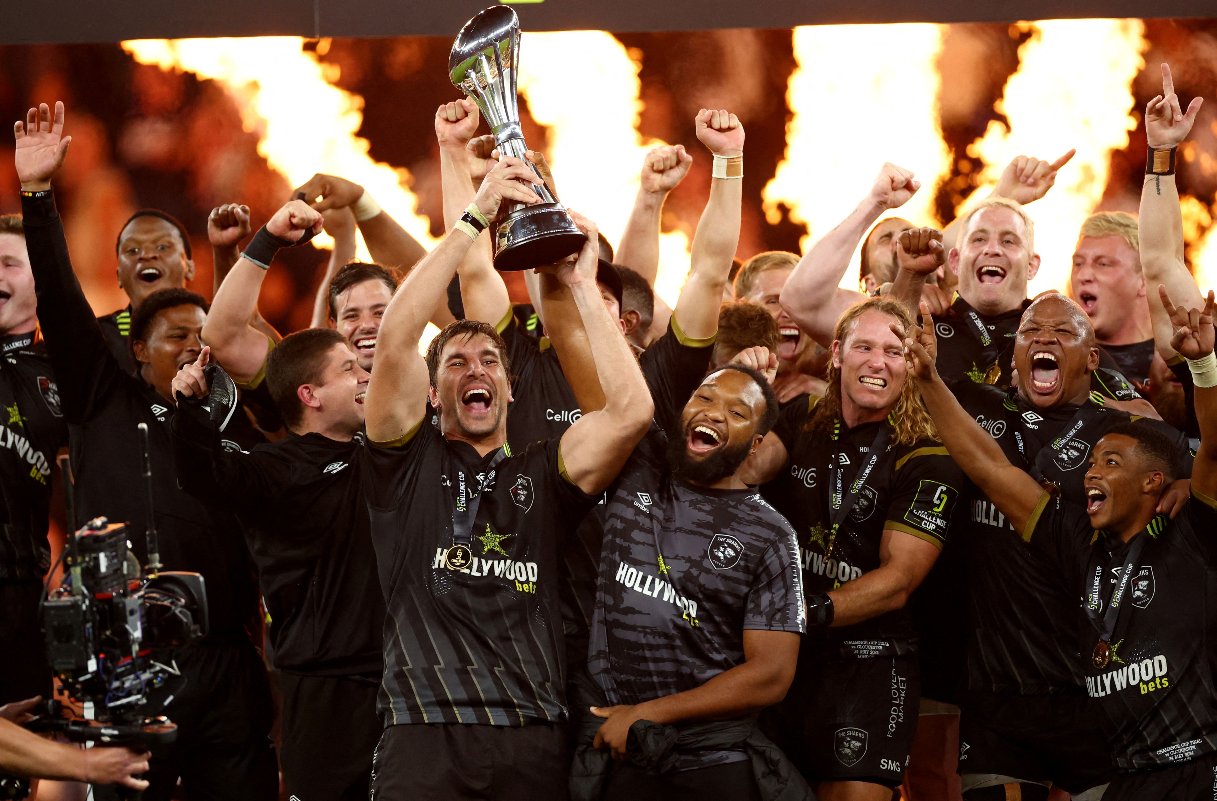 Eben Etzebeth of Hollywoodbets Sharks lifts the trophy after his team's victory in the EPCR Challenge Cup Final match between Gloucester Rugby and Hollywoodbets Sharks at Tottenham Hotspur Stadium on May 24, 2024 in London, England. (Photo by Andrew Boyers/Action Images via Reuters)