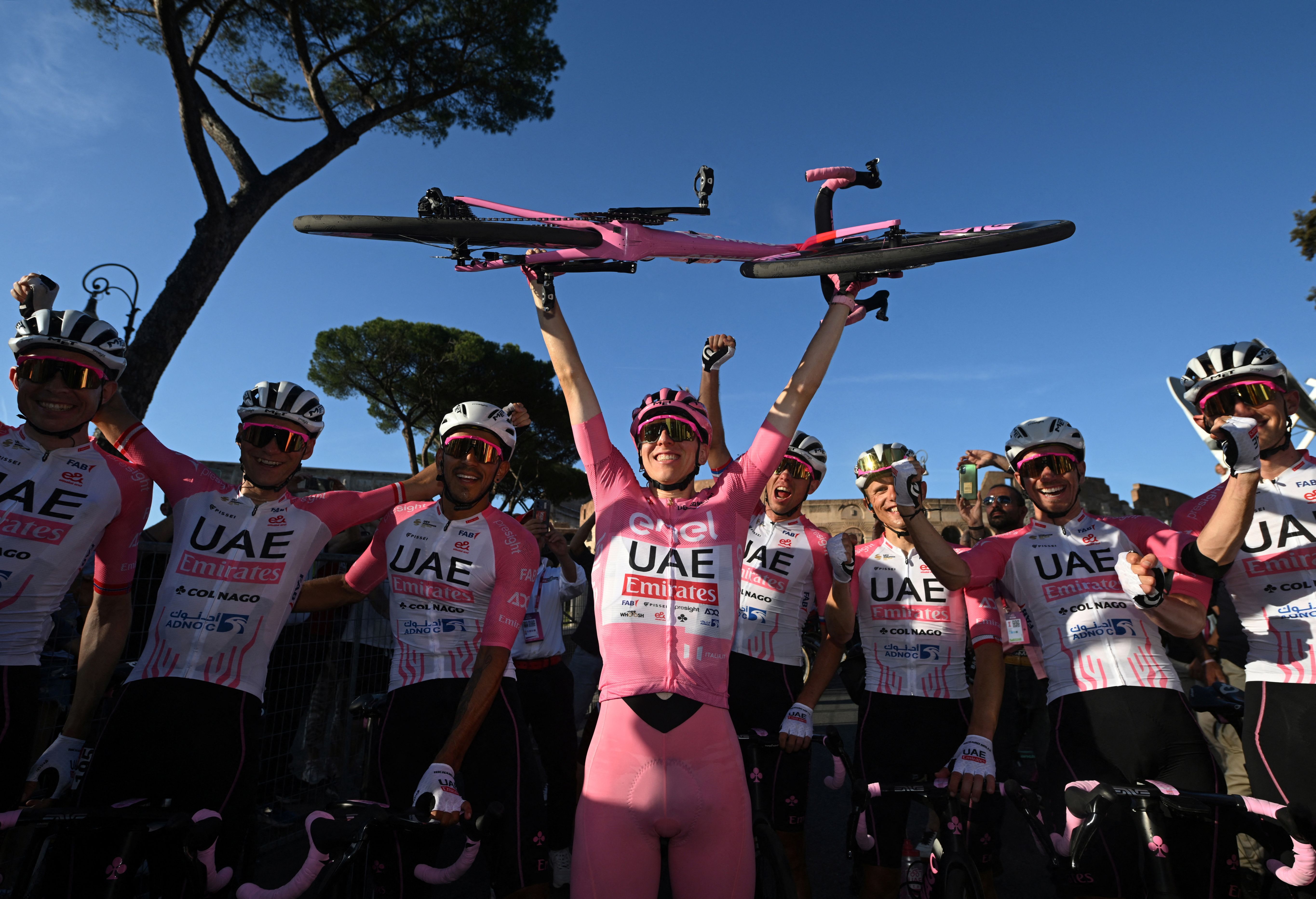 Tadej Pogacar of Slovenia and UAE Team Emirates – Pink Leader Jersey (C) celebrates with his teammates as final race overall winner after 107th Giro d'Italia 2024, Stage 21 a 125km stage from Rome to Rome / #UCIWT / on May 26, 2024 in Rome, Italy. (Photo by Dario Belingheri/Reuters)