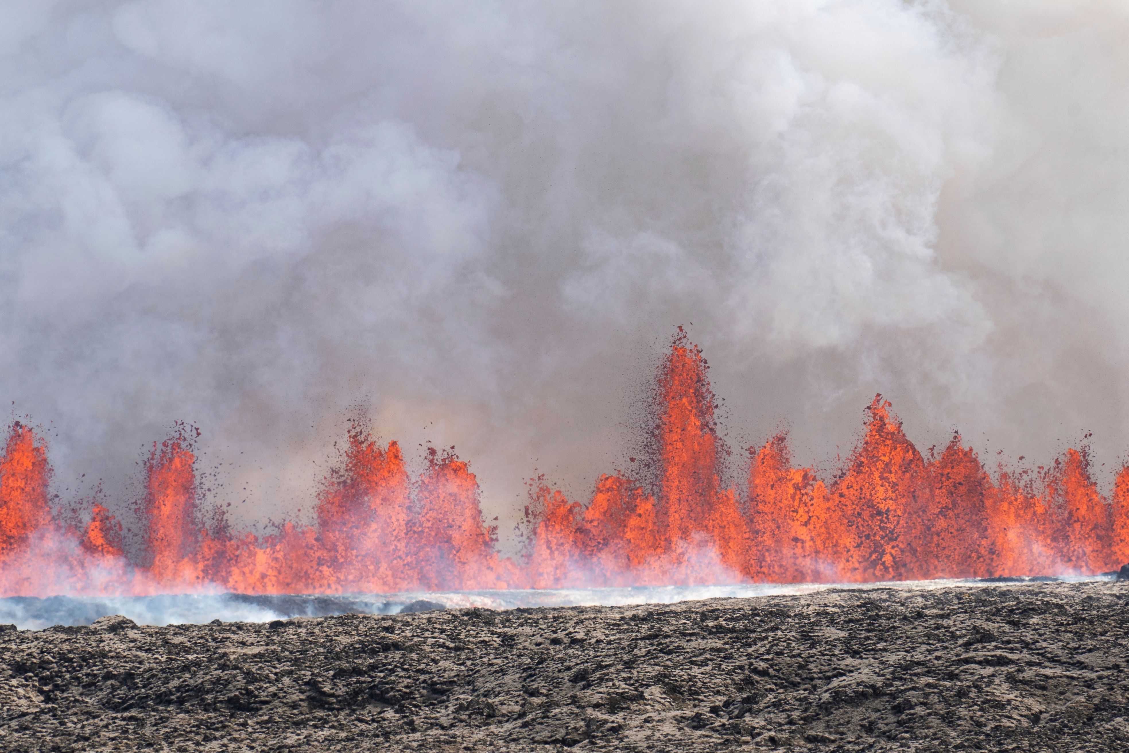 A volcano spews lava in Grindavik, Iceland, Wednesday, May 29, 2024. A volcano in southwestern Iceland is erupting, spewing red streams of lava in its latest display of nature's power. A series of earthquakes before the eruption Wednesday triggered the evacuation of the popular Blue Lagoon geothermal spa. The eruption began in the early afternoon north of Grindavik, a coastal town of 3,800 people that was also evacuated. (Photo by Marco di Marco/AP Photo)