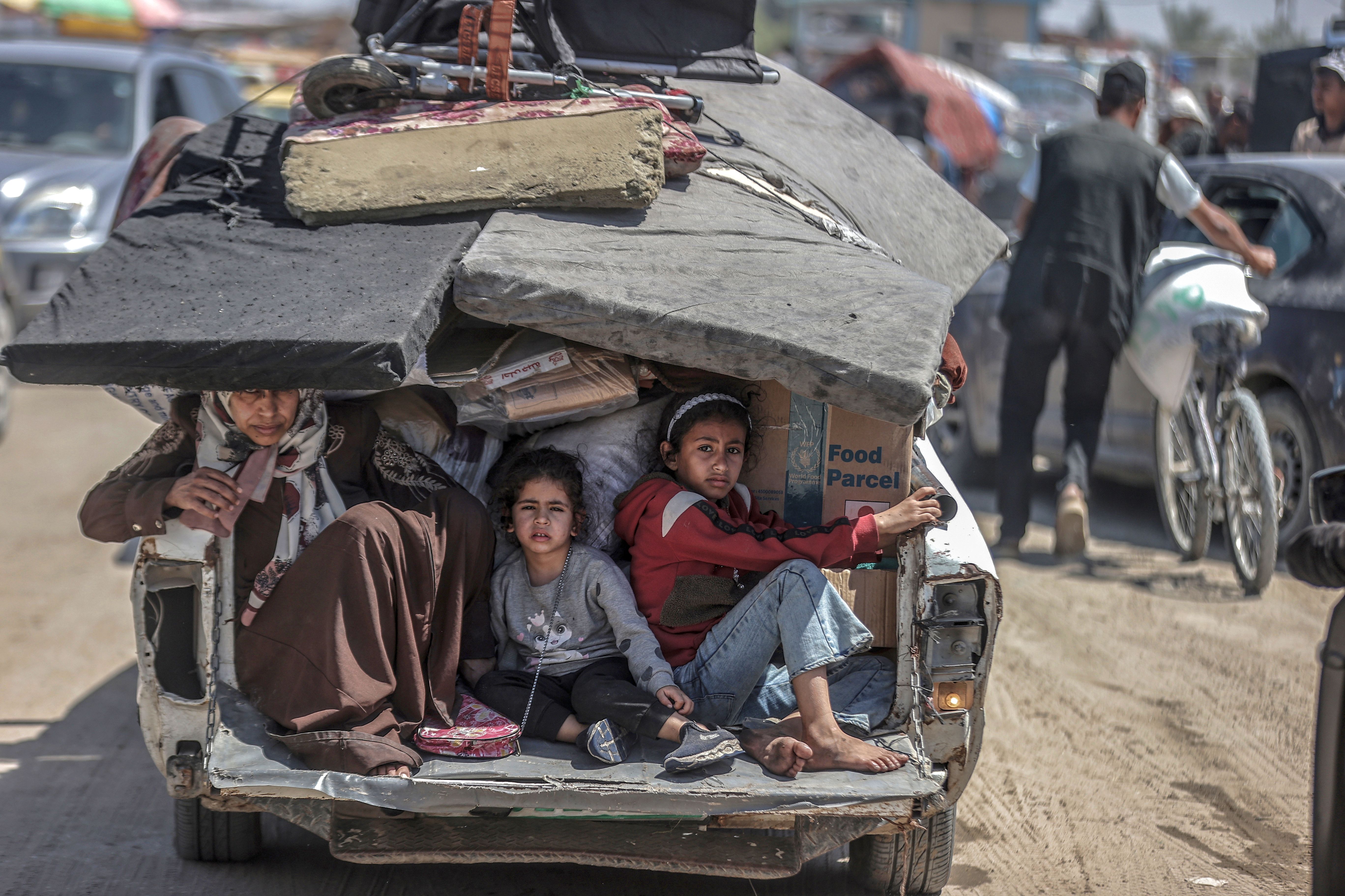 Children sit back on a truck as Palestinians with their packed belongings, continue to depart from the eastern neighborhoods of the city due to ongoing Israeli attacks in Rafah, Gaza on May 8, 2024. (Photo by Ali Jadallah/Anadolu via Getty Images)