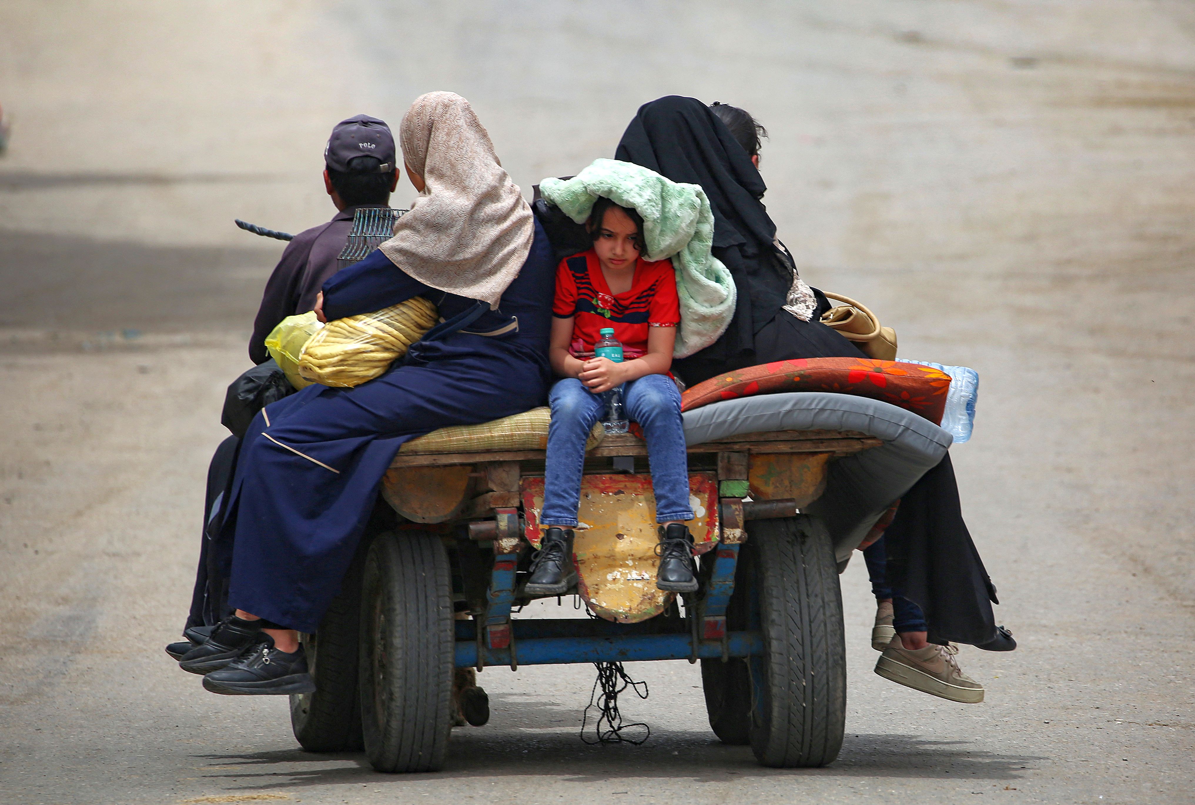 Palestinians sit on an animal pulled cart as they move to safer areas in Rafah, in the southern Gaza Strip, on May 10, 2024, amid the ongoing conflict between Israel and the militant group Hamas. (Photo by AFP Photo/Stringer)