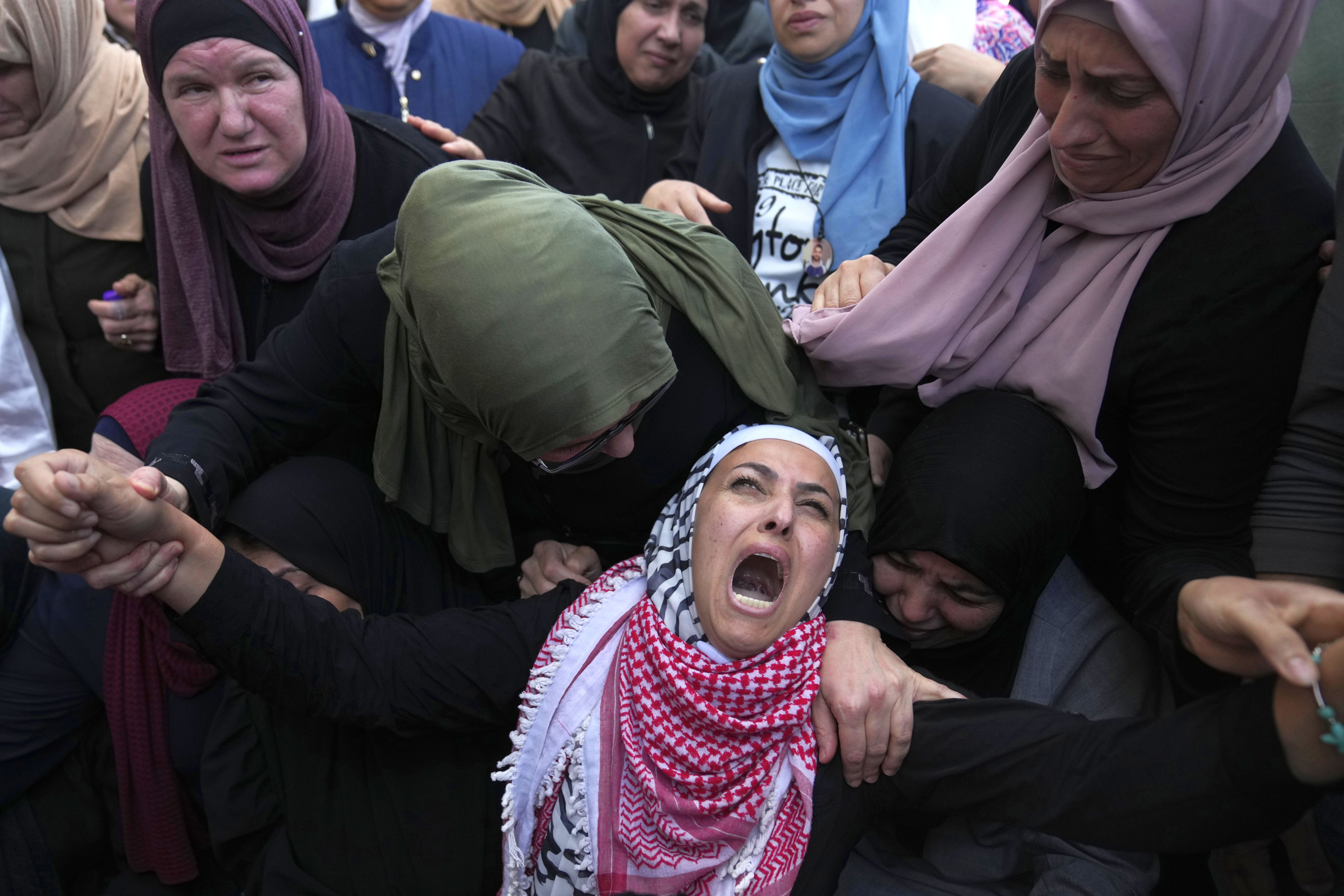 Palestinian Fayrouz Safi cries while she takes the last look at the body of her son Aysar Safi, 20, at the family house during his funeral in the West Bank refugee camp of Jalazoun, north of Ramallah Wednesday, May 15, 2024. Safi was killed during clashes with Israeli forces at the northern entrance of al-Bireh city, Palestinian ministry of health said. (Photo by Nasser Nasser/AP Photo)