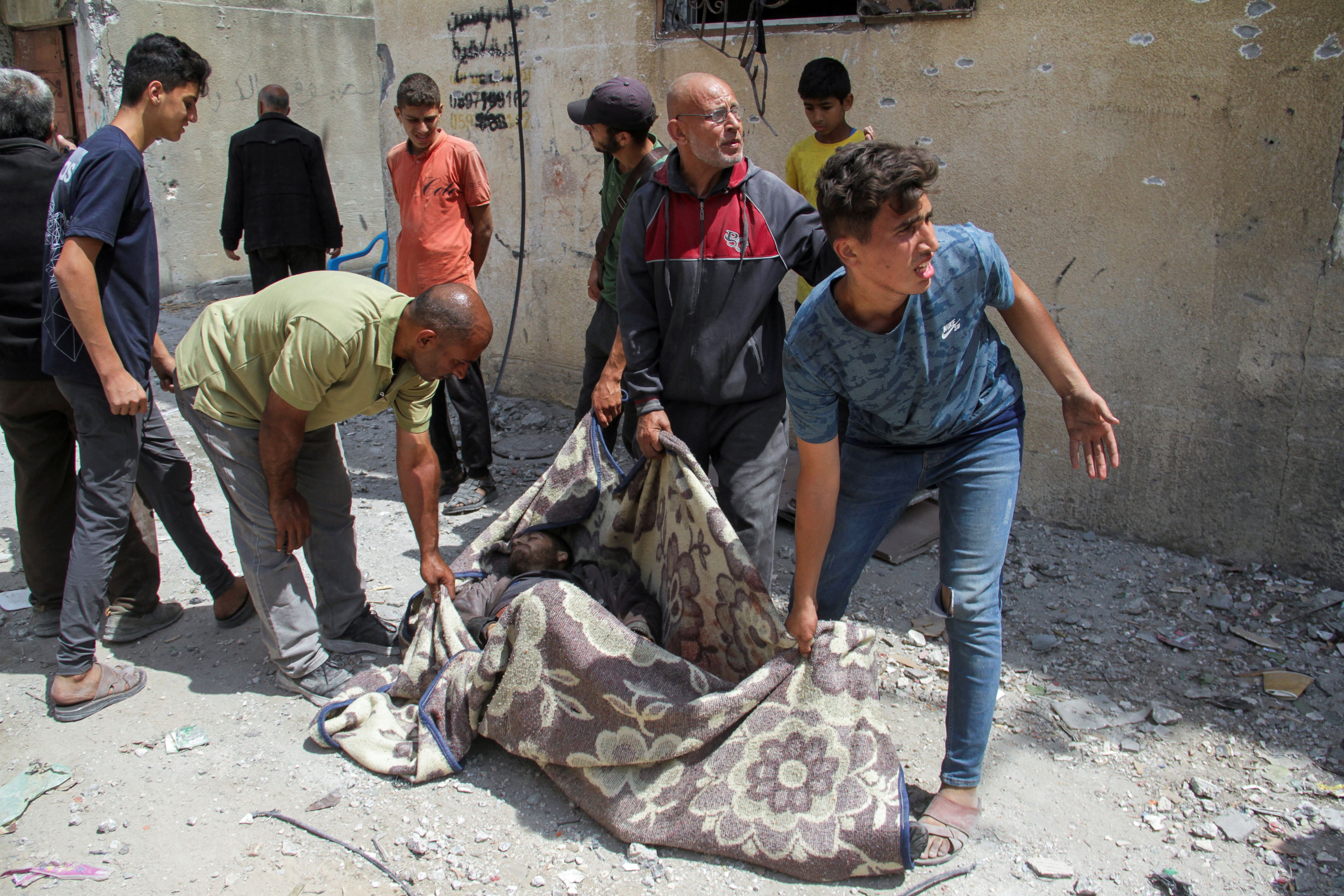Palestinians carry the dead body of a man at Zeitoun neighborhood after Israeli forces withdrew from the area following a raid, in Gaza City, on May 15, 2024. (Photo by Mahmoud Issa/Reuters)