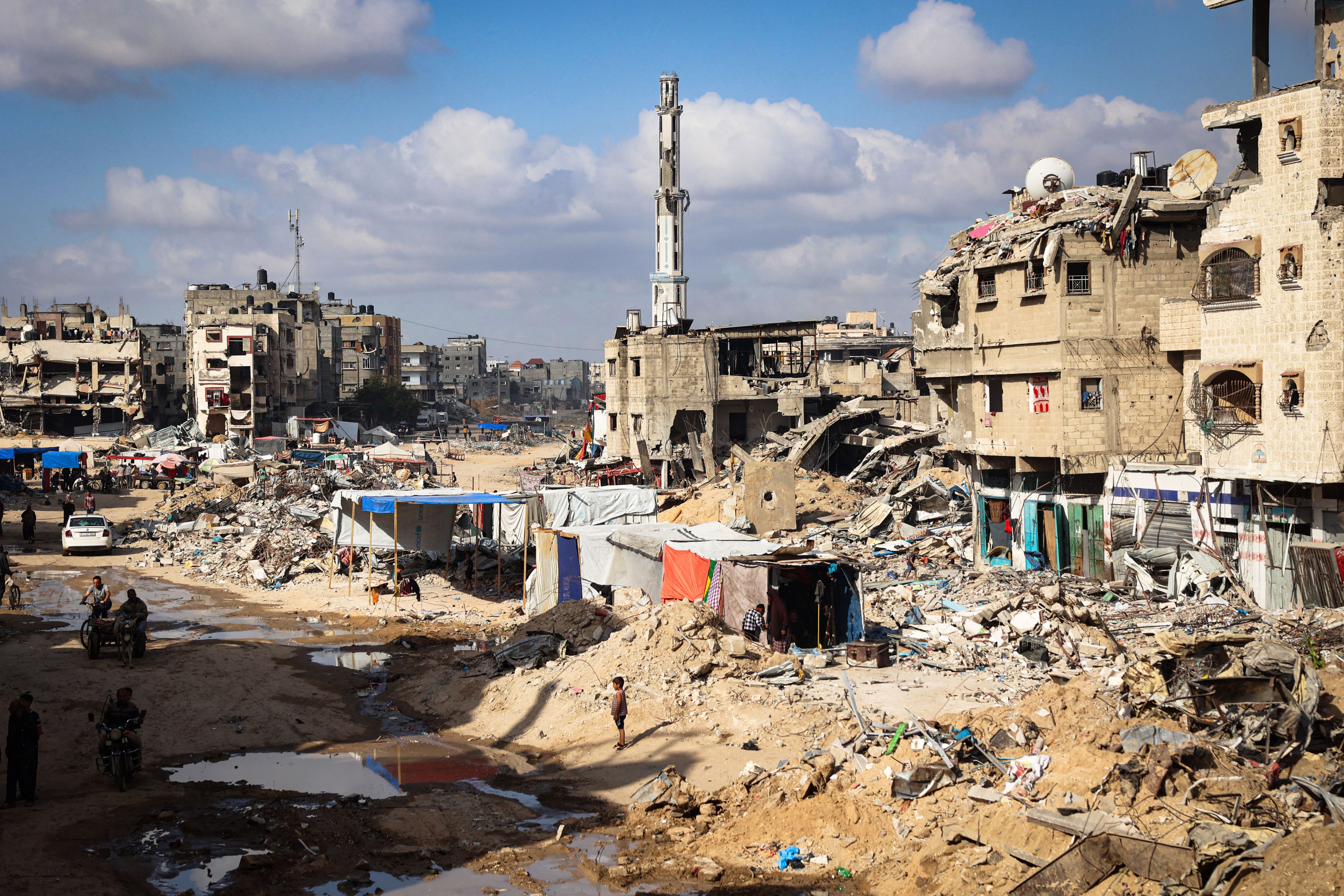 Tents are set up by displaced Palestinians amid the devastation in Khan Yunis in the southern Gaza Strip on May 16, 2024, as the conflict between Israel and the militant group Hamas continues. (Photo by AFP Photo/Stringer)