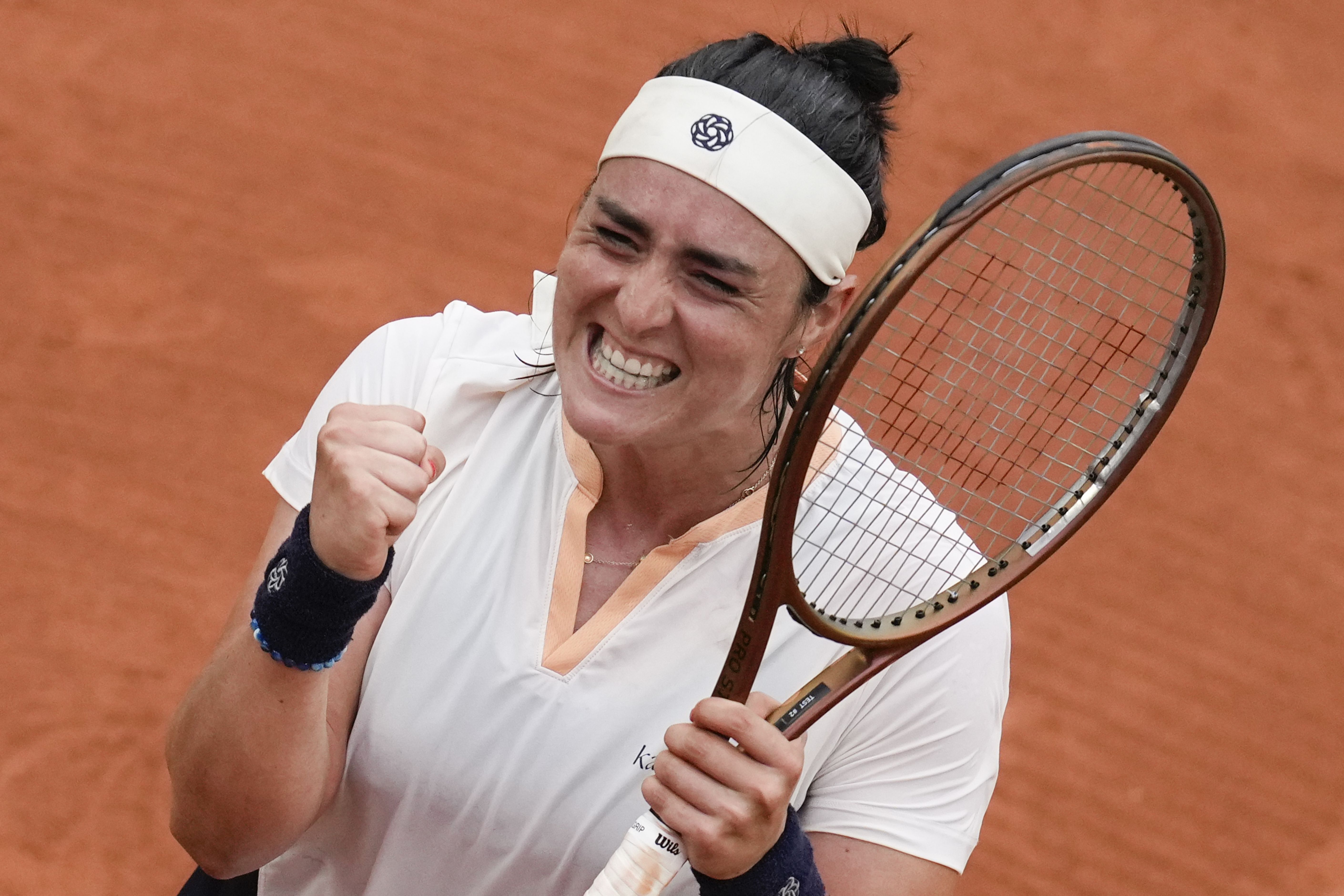 Tunisia's Ons Jabeur celebrates winning her second round match of the French Open tennis tournament against Colombia's Camila Osorio at the Roland Garros stadium in Paris, Wednesday, May 29, 2024. (Photo by Christophe Ena/AP Photo)