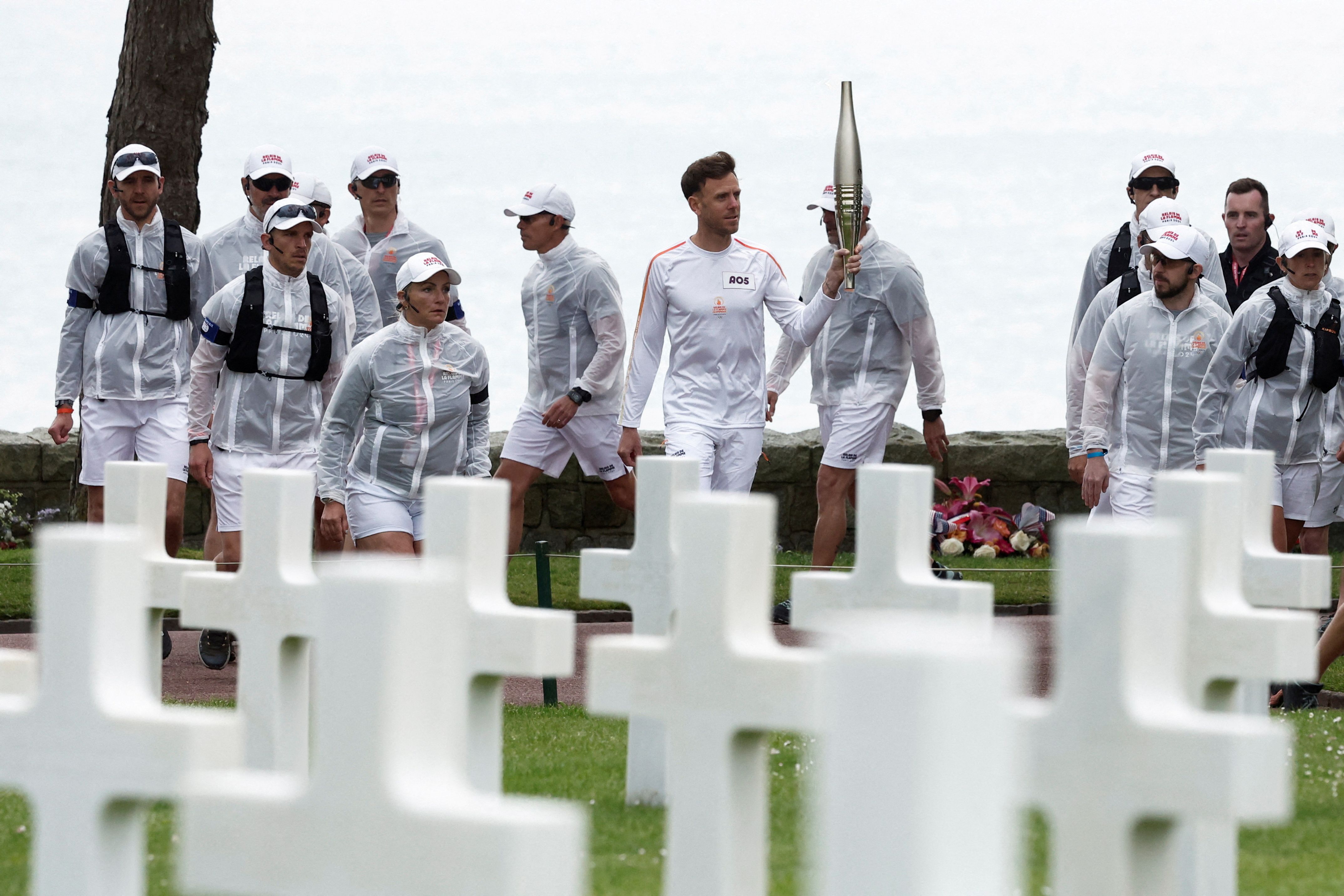 Torchbearer Nicolas-Marie Daru holds the Olympics torch during the relay ahead of the Paris 2024 Olympic games, at the World War II Normandy American Cemetery and Memorial, in Colleville-sur-Mer, situated above Omaha Beach, Normandy region, France on May 30, 2024. (Photo by Benoit Tessier/Reuters)