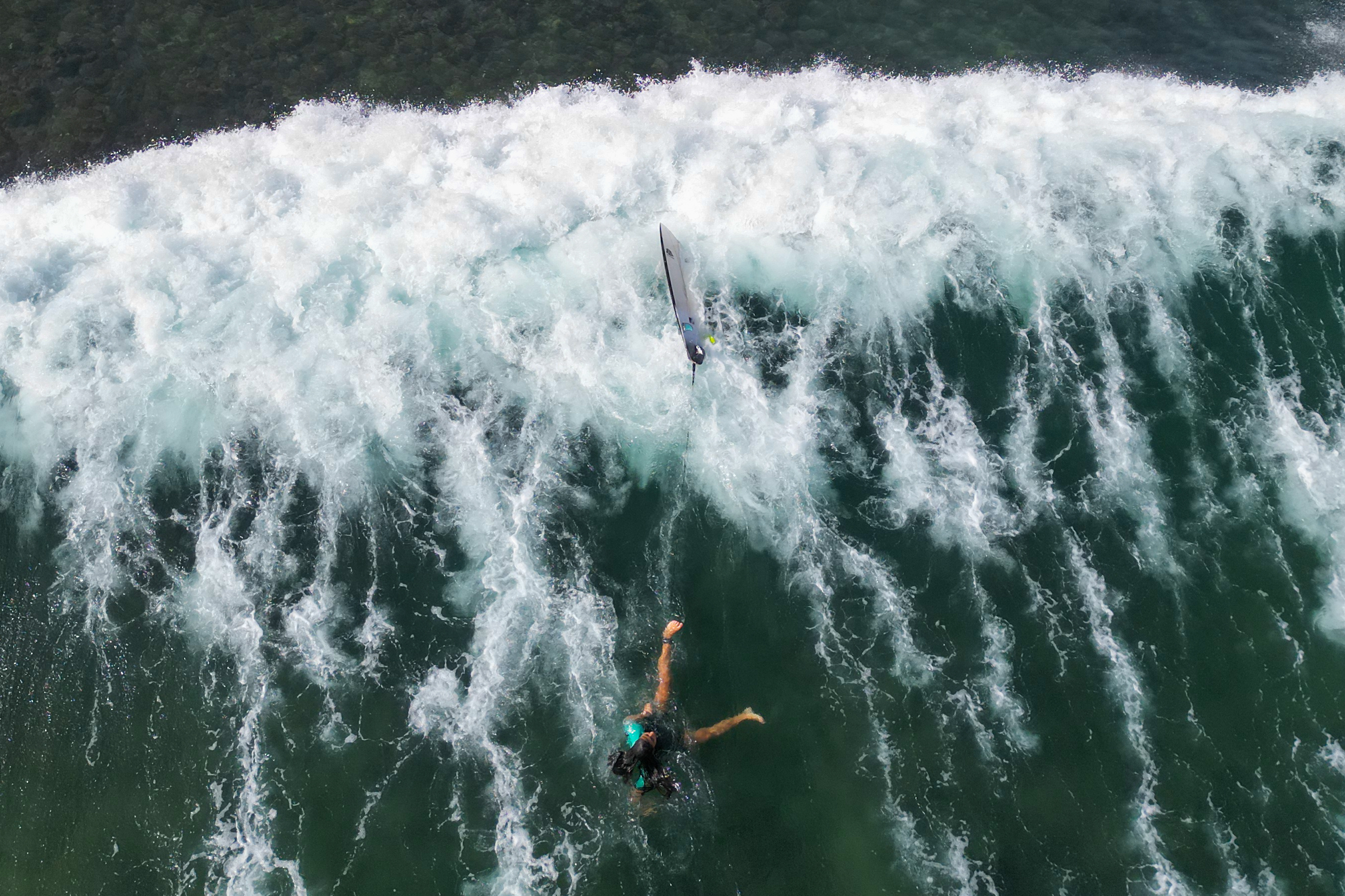 An aerial view of a surfer falling off of his shortboard among the giant waves of Atlantic Ocean in Dakar, Senegal on May 25, 2024. In Senegal, which has 724 kilometres of coastline, surf schools with large and small beaches along the coastline are flooded by surfing enthusiasts. Surfers gather at the beach at noon enjoy the sea until the evening hours as the waves grow. (Photo by Cem Ozdel/Anadolu via Getty Images)