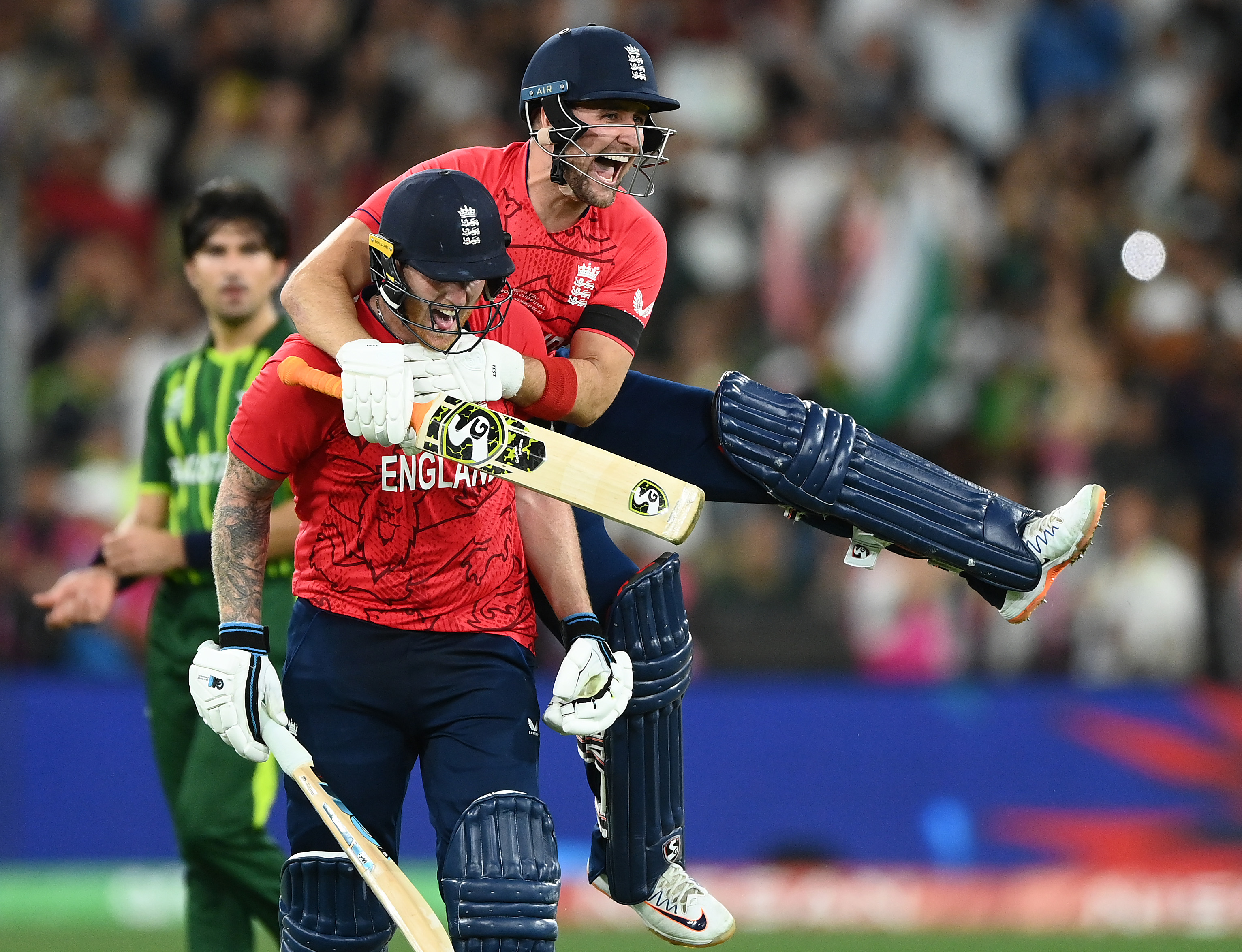 Ben Stokes and Liam Livingstone of England celebrate winning the ICC Men's T20 World Cup Final match between Pakistan and England at the Melbourne Cricket Ground on November 13, 2022 in Melbourne, Australia. (Photo by Quinn Rooney/Getty Images)