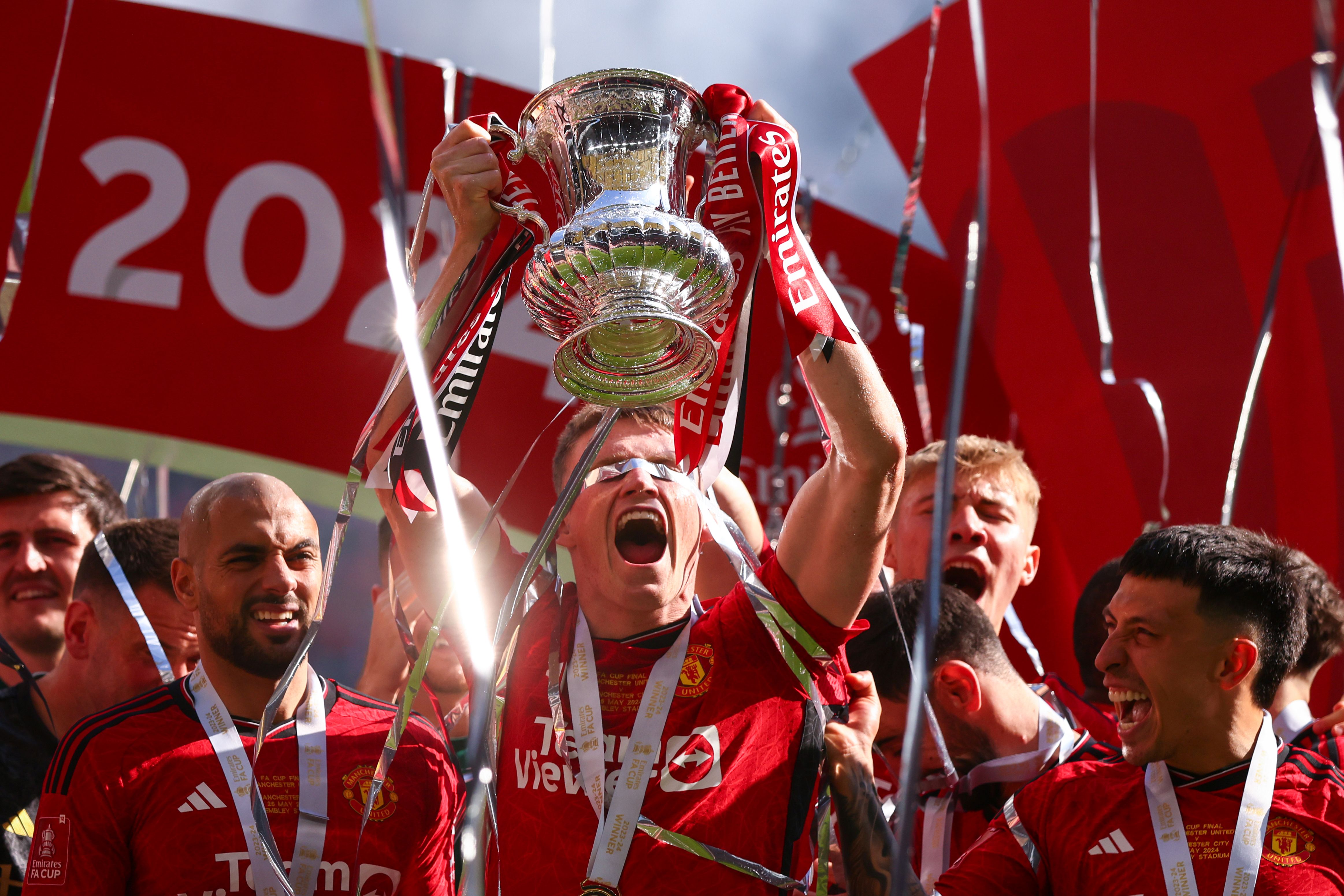 Scott McTominay of Manchester United celebrates with the trophy during the Emirates FA Cup Final match between Manchester City and Manchester United at Wembley Stadium on May 25, 2024 in London, England. (Photo by Marc Atkins/Getty Images)