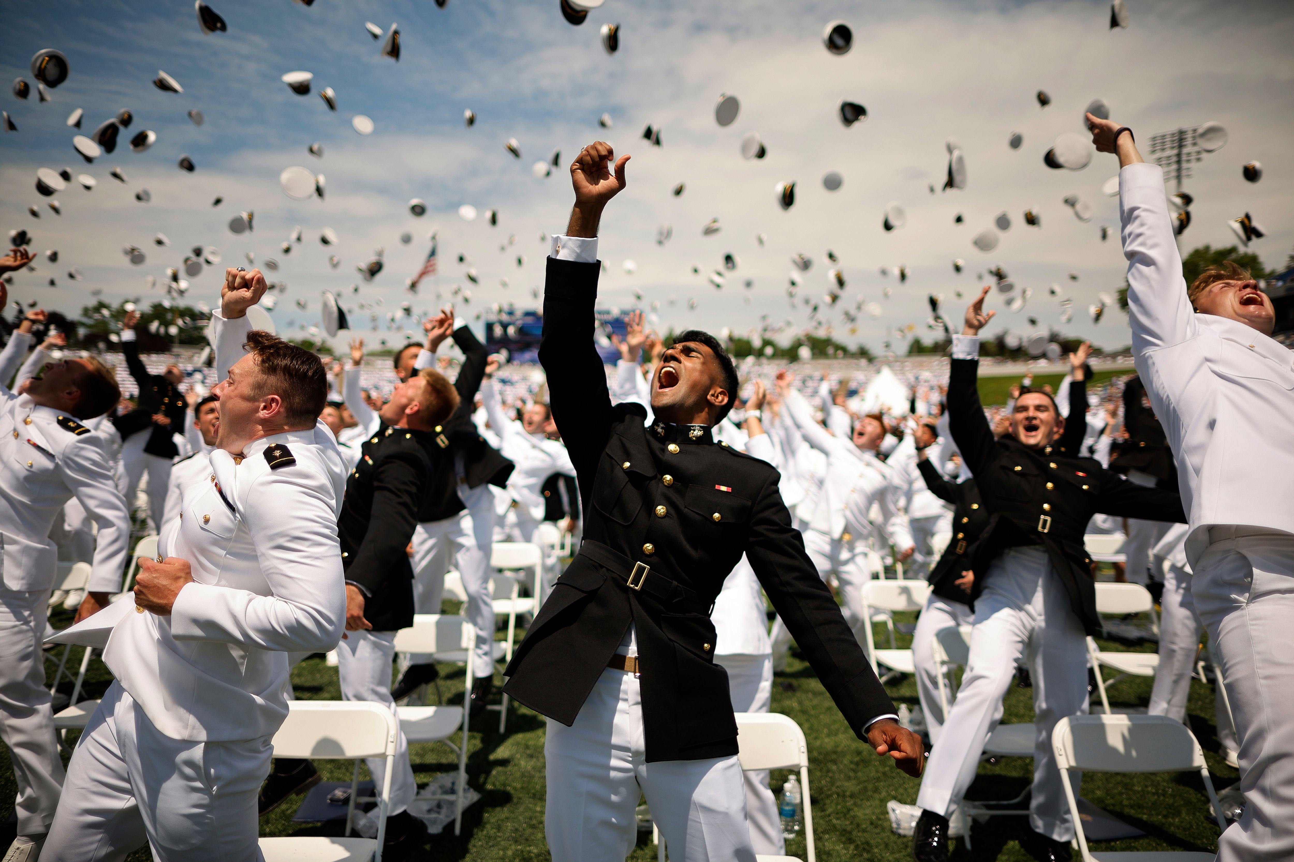 U.S. Naval Academy graduates throw their hats into the air at the conclusion of their graduation ceremony at the Navy-Marine Corps Memorial Stadium at the academy on May 24, 2024 in Annapolis, Maryland. 1040 men and women graduated from the academy and will enter the Navy as ensigns or the Marine Corps as 2nd lieutenants, where they will serve for at least five years. (Photo by Chip Somodevilla/Getty Images)