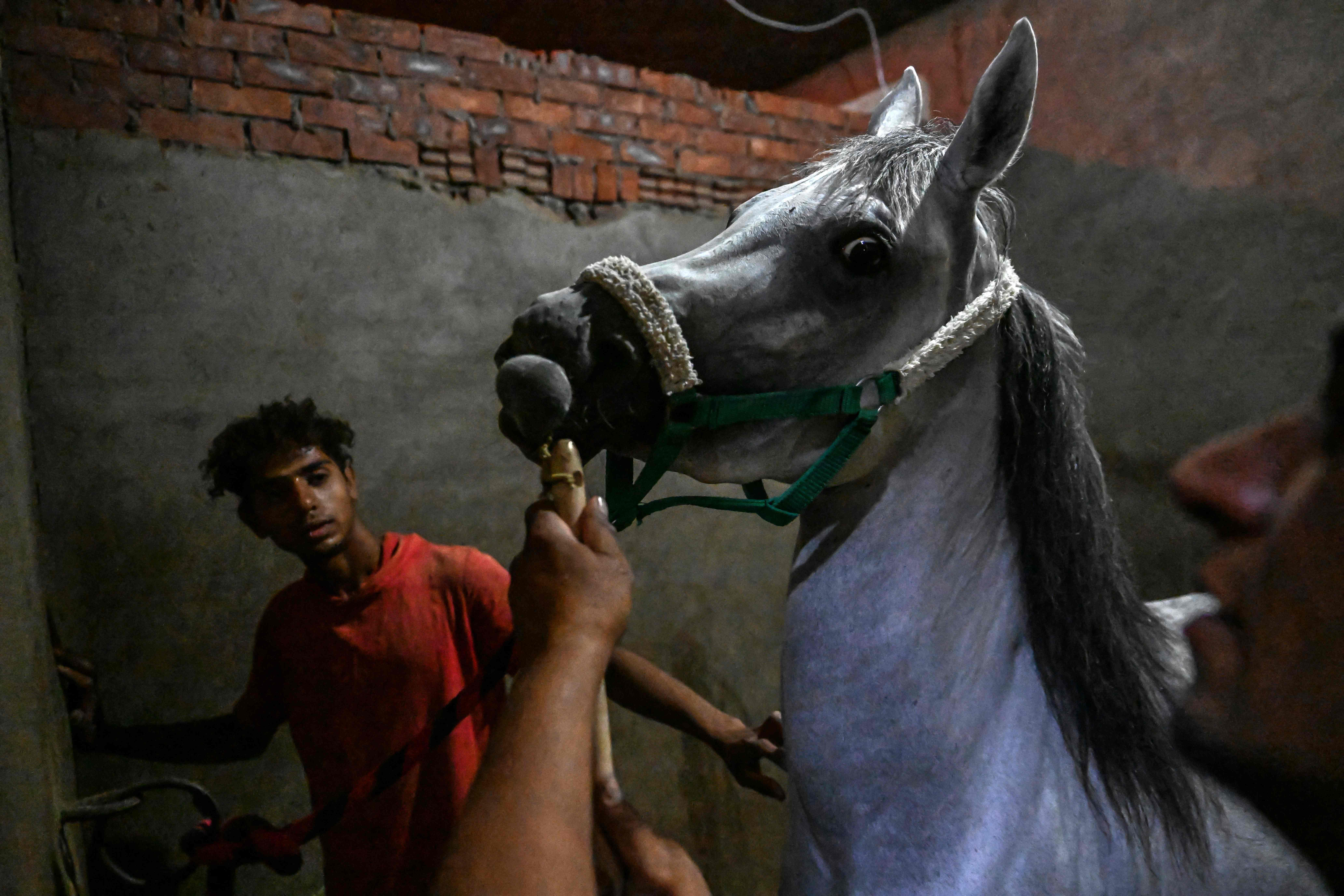 An Egyptian horse owner cares for one of his animals at stables in Giza near the capital on May 26, 2024. (Photo by Khaled Desouki/AFP Photo)