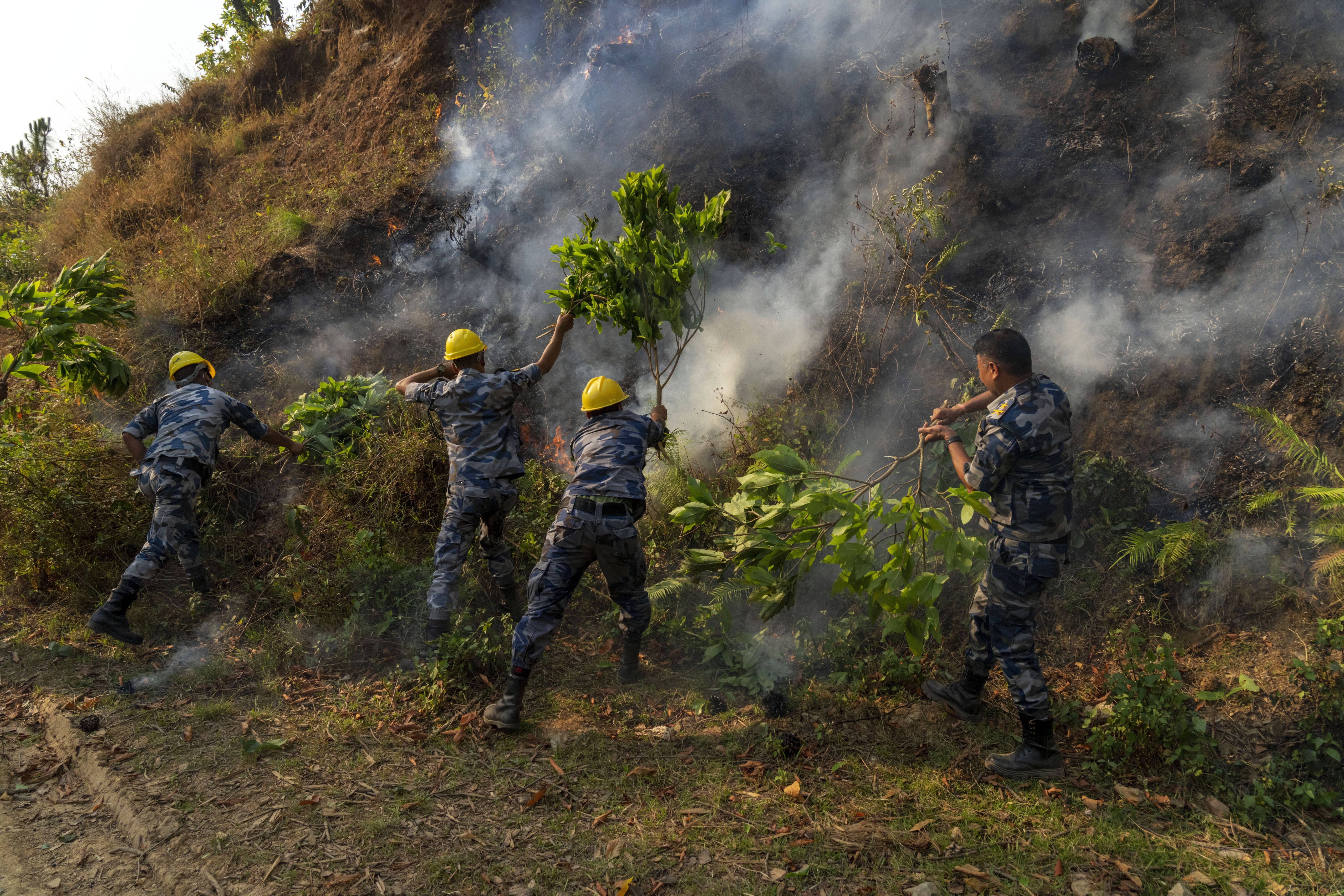 Police officers douse a forest fire in Shivapuri National Park on the outskirts of of in Lalitpur, Nepal, Tuesday, April 30, 2024. According to Lalitpur District Police a person passed away after sustaining injuries while attempting to put out the fire. (Photo by Niranjan Shrestha/AP Photo)