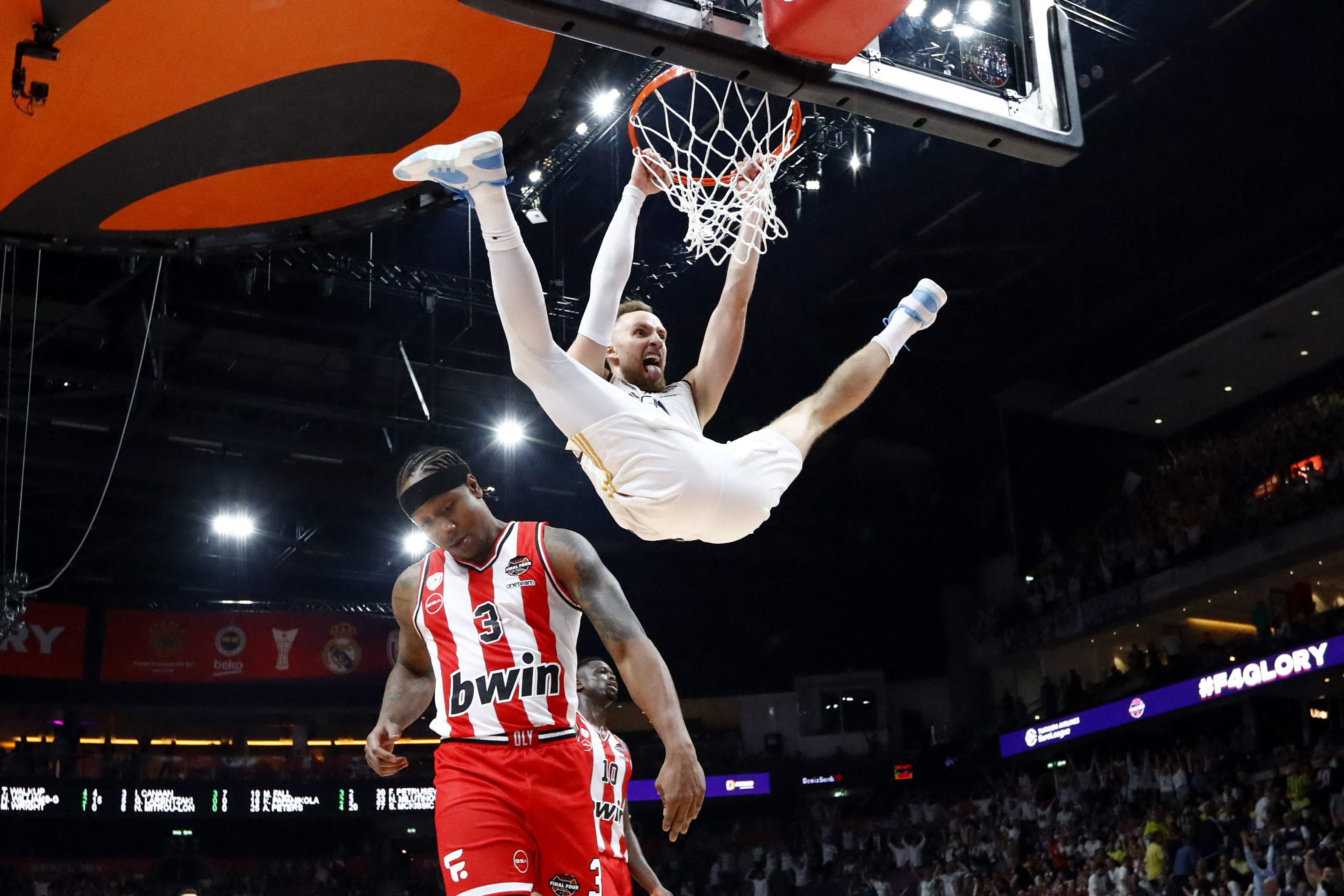 Real Madrid's Dzanan Musa reacts after scoring a basket during the EuroLeague Final Four match between Real Madrid and Olympiacos Piraeus at Uber Arena in Berlin, Germany, on May 24, 2024. (Photo by Fabrizio Bensch/Reuters)